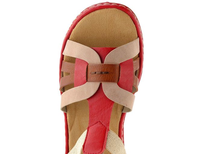 Dámské sandálky červeno-béžovém provedení, se dvěma pružinkami po stranách pro pohodlné obutí i nošení.