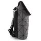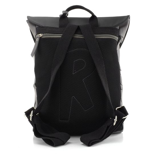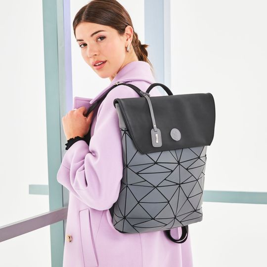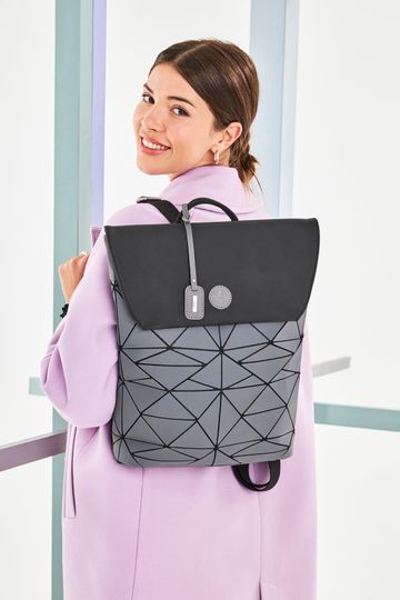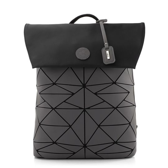 Batoh vyniká antracitově šedou barvou doplněnou černými detaily a originálním vzorem, který tvoří jednotlivé dílky z materiálu podobného silikonu nalepené na textilním podkladě. Klopa se zapíná na magnetický druk a pod ní najdete zip pro bezpečné uzavírání.