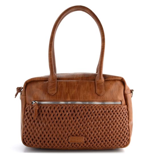 Praktická dámská kabelka v hnědé barvě barvě s proplétanou přední kapsou a odepínatelným ramenním popruhem.