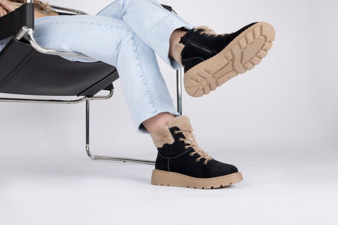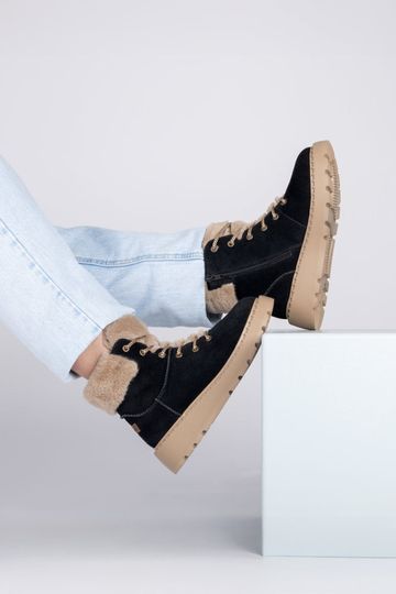 Pro snadné obutí je na vnitřní straně umístěn zip. Vnitřní teplá podšívka z umělého beránku a kožešinkový lem příjemně hřejí. Vyjímatelná vložka potažená filcem a syntetická platforma s hrubým vzorkem zajišťují pohodlí i stabilitu. Výška kotníku je 12 cm, což dodává botám elegantní siluetu. Volba pro ženy, které ocení kvalitu a design.