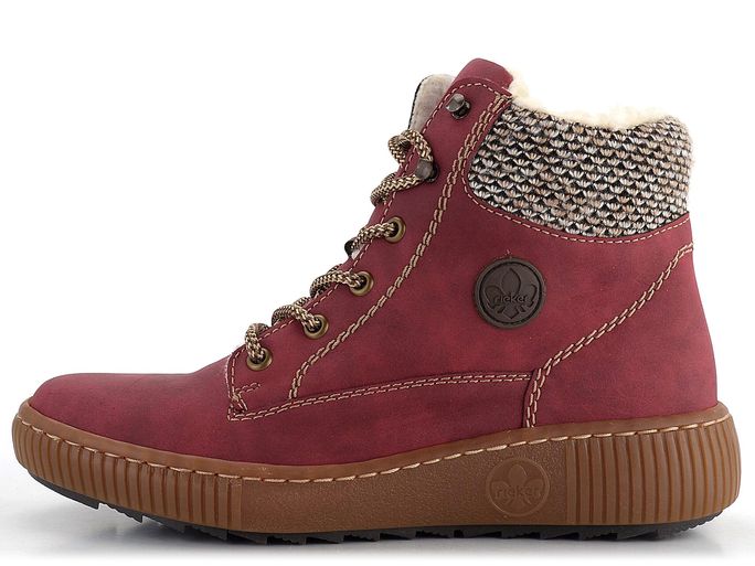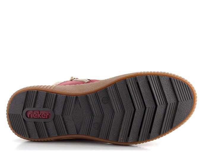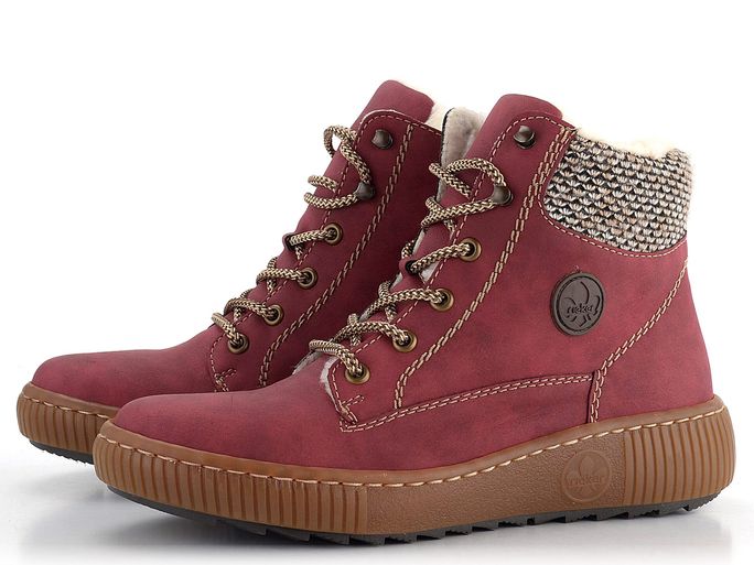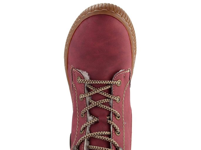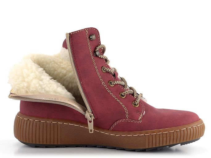 Představujeme pohodlný zimní model dámského kotníku od značky Rieker. Tyto boty zaujmou svým ležérním střihem a tmavě červenou barvou se stínováním, která přechází do vínové. Svršek je vyroben z matné syntetiky, což zaručuje odolnost a snadnou údržbu. Boty mají šněrování s kovovými průvleky a postranní zip pro snadné obutí. Silně polstrovaný náplet s béžovo-černým vzorkem je příjemný při chůzi a udržuje teplo uvnitř obuvi. Uvnitř najdete velmi teplou podšívku z umělého beránku a měkkou filcovou stélku. Pohodlná latexová podešev s protismykovým dezénem zajišťuje bezpečný krok i na kluzkém povrchu. Výška podpatku je 4 cm a výška kotníku 10,5 cm (bez podešve). Boty jsou šité výrobním způsobem, což zajišťuje vysokou flexibilitu a pohodlí, avšak nezaručuje vodotěsnost. Pro zvýšení odolnosti vůči vlhku doporučujeme použít impregnační přípravky.