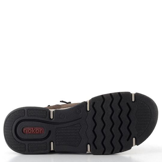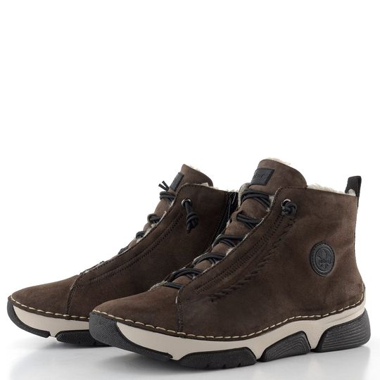 Pohodlné a stylové kotníkové boty značky Rieker jsou ideální volbou pro podzimní a zimní dny. Tento model v tmavě hnědé, zemitě barevné variantě se vyznačuje gumičkovým šněrováním, které usnadňuje obouvání, a praktickým zipem na vnitřní straně. Kulatá špička poskytuje dostatek prostoru pro standardní až mírně širší chodidlo.