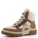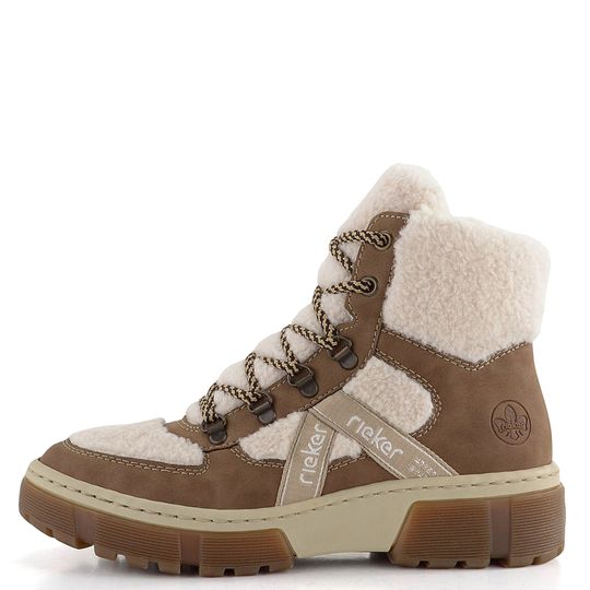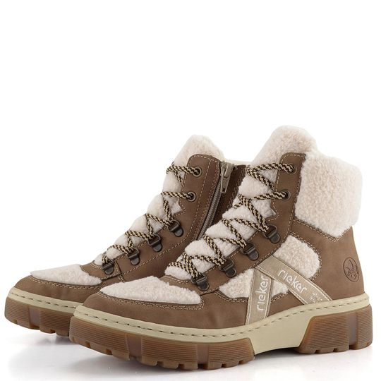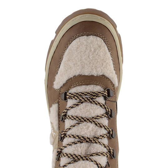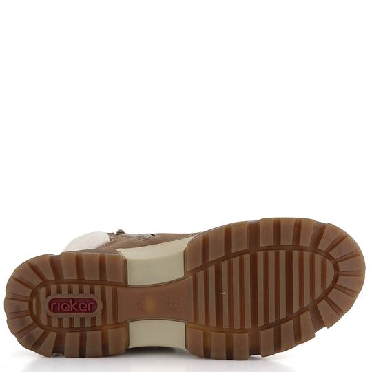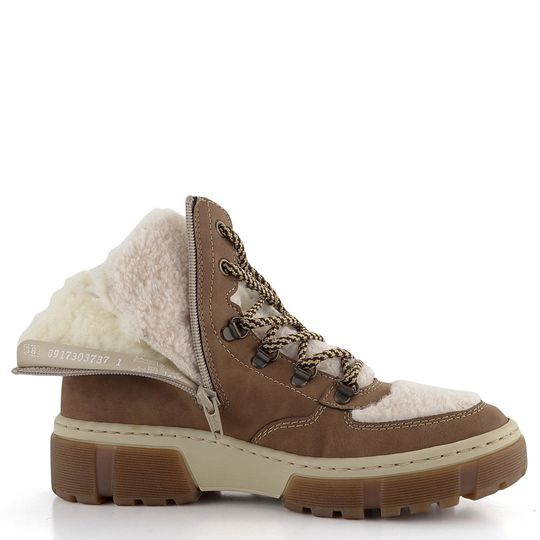 Dámský zimní kotník od značky Rieker je ideální volbou pro chladné podzimní a zimní dny. Tento elegantní model v tmavě béžové barvě doplněný smetanovým odstínem beránku nabízí nejen styl, ale i pohodlí. Svršek je vyroben z matné syntetiky v kombinaci s textilií, což zajišťuje odolnost a dlouhou životnost. Teplá podšívka z umělého beránku udrží vaše nohy v teple, zatímco polstrovaná bandáž poskytuje maximální komfort. Kotník má kulatá šněrovadla a zip na vnitřní straně pro snadné obutí. Vyjímatelná stélka potažená filcem a vysoká platforma s latexovým nášlapem a hrubým vzorkem zajišťují stabilitu a pohodlí při chůzi. Výška podpatku je 4,5 cm a výška kotníku 11 cm (bez podešve). Tento model je ideální pro ženy hledající kvalitní a stylovou obuv do města i na lehkou procházku.