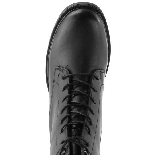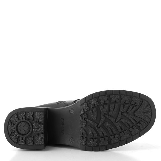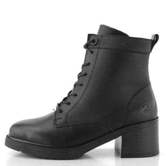 Dámský zateplený kotník na podpatku od značky Rieker je ideální volbou pro podzimní a zimní období. Tento nadčasový model v oblíbené černé barvě se pyšní hladkou koženou konstrukcí a elegantním designem. Kotníkový lem s jemným raženým vzorkem dodává obuvi šmrnc, zatímco šněrování s tenkými kulatými tkaničkami zajišťuje pohodlné nošení.