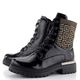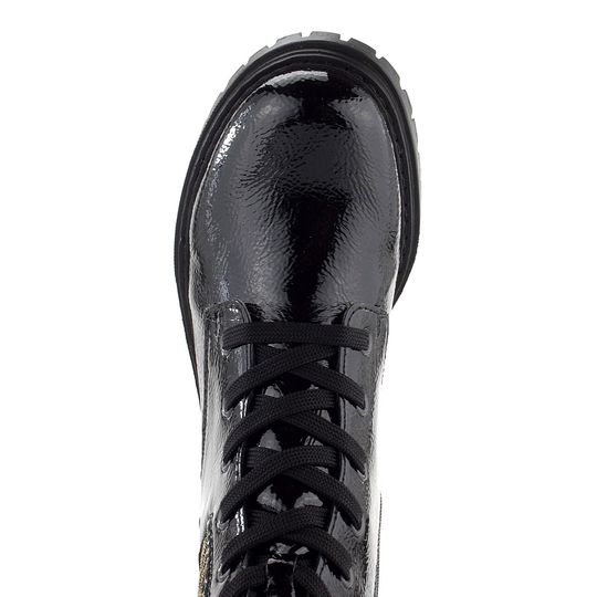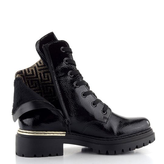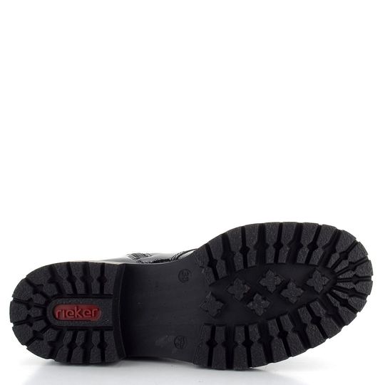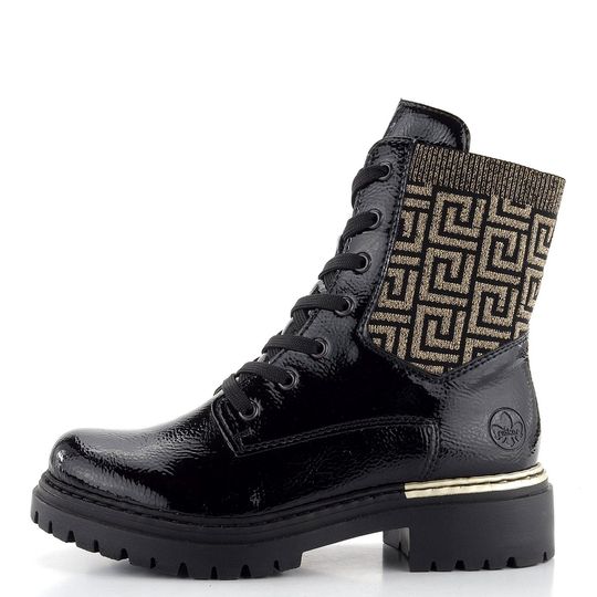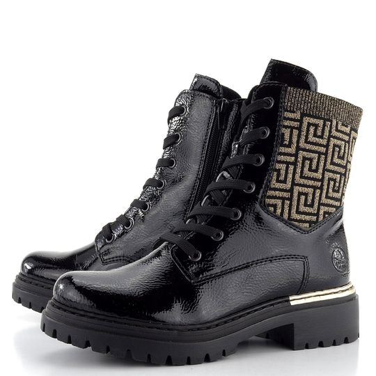 Dámský módní kotník od značky Rieker v elegantní černé barvě je ideální volbou pro podzimní a zimní sezónu. Boty mají komfortní kulatý střih a jsou vyrobeny ze syntetiky s lakovanou strukturou. Stylová pružná pletenina na vnějším boku, protkaná metalickou béžovou nitkou, dodává botám jedinečný vzhled. Díky šněrování a zipu na vnitřní straně je obutí snadné a rychlé. Uvnitř najdete teplou podšívku z hebkého textilního vlasu a extra měkkou stélku potaženou filcem. Boty disponují módní vysokou platformou s hrubým vzorkem a výškou podpatku 4,5 cm. Výška kotníku je 15 cm. Tento model je vyroben šitým způsobem, což zaručuje pohodlí a flexibilitu, avšak nezaručuje vodotěsnost. Pro zvýšení odolnosti vůči vlhku doporučujeme použít vhodné impregnační přípravky.