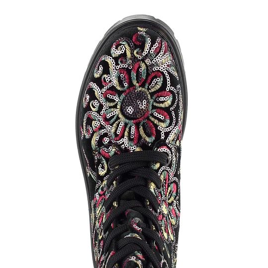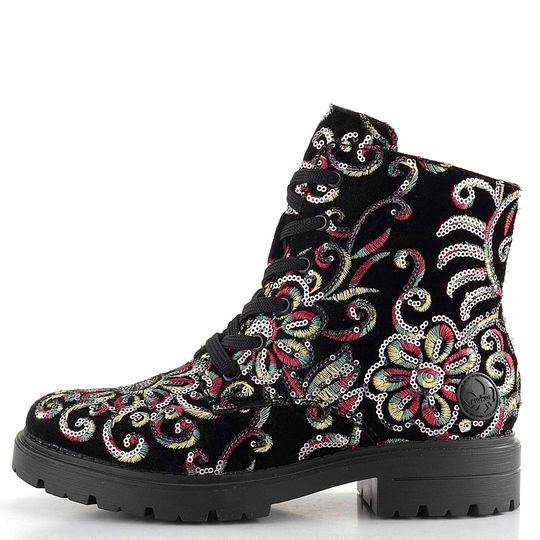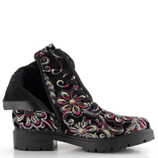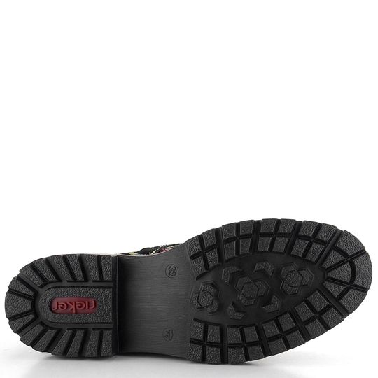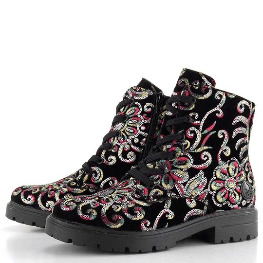 Dámský zateplený kotník od značky Rieker je ideální volbou pro podzimní a zimní sezónu. Vyrobený z jemné sametové textilie v černé barvě, tento model zaujme barevným vyšívaným vzorem doplněným o stříbrné flitry. Šněrování je prakticky doplněno o funkční zip na vnitřní straně, což usnadní obouvání. Uvnitř boty se nachází teplá podšívka s hebkým vlasem, která zajistí maximální pohodlí i v chladnějších dnech. Měkká filcová stélka je vyjímatelná, což oceníte při údržbě. Bytelná latexová podešev s hrubým vzorkem a širokým, nízkým podpatkem o výšce 3,8 cm poskytuje stabilitu a komfort při každém kroku. Výška kotníku je 13 cm (bez podešve), což dodává botě elegantní vzhled. Tento model je určen pro ženy, které hledají kvalitní a stylovou obuv na každodenní nošení.
