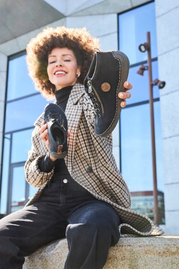 Dámský šněrovací kotník s teplou podšívkou a postranním zipem pro snadné obutí.
