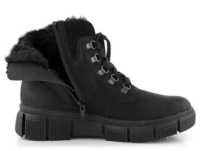 Hledáte stylové a funkční boty pro podzim a zimu? Dámský šněrovací kotník se zipem od značky Rieker je ideální volbou. Boty disponují prostorným střihem s kulatou špičkou a svrškem ze strukturované syntetiky, což zajišťuje nejen pohodlí, ale i moderní vzhled. Díky zipu na vnitřní straně je obutí snadné a rychlé. Uvnitř najdete teplou podšívku z umělého beránka a stélku potaženou filcem, což udrží vaše nohy v teple i během chladných dnů. Boty jsou vybaveny vodoodpudivou membránou riekerTEX®, která chrání před vlhkostí. Vysoká latexová platforma s hrubším vzorkem a výškou podpatku 4,5 cm poskytuje stabilitu i na kluzkém povrchu. Tento model je skvělou volbou pro každodenní nošení ve městě i na lehčí procházky. Vyberte si kvalitu a komfort od značky Rieker.