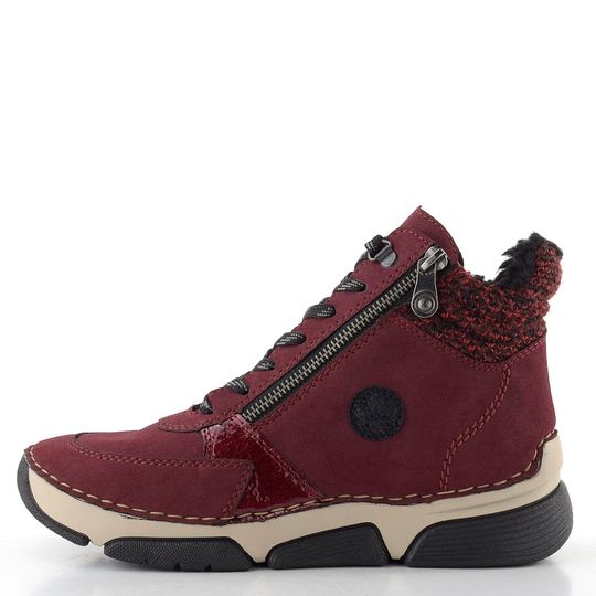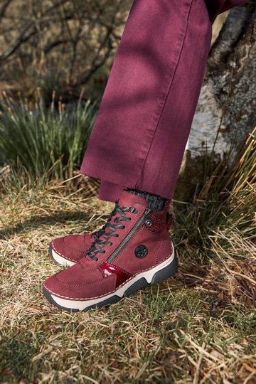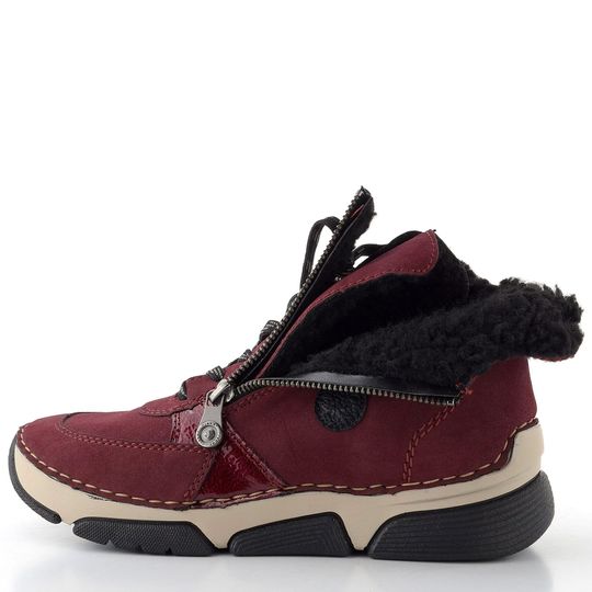 Pohodlí a styl se snoubí v tomto zimním modelu dámského kotníku od značky Rieker. Jeho vínově červená barva a elegantní design z broušené syntetiky s lakovanými doplňky přitáhnou pozornost každého kolemjdoucího. Díky prostorné kulaté špičce se hodí pro standardní až mírně širší chodidlo.