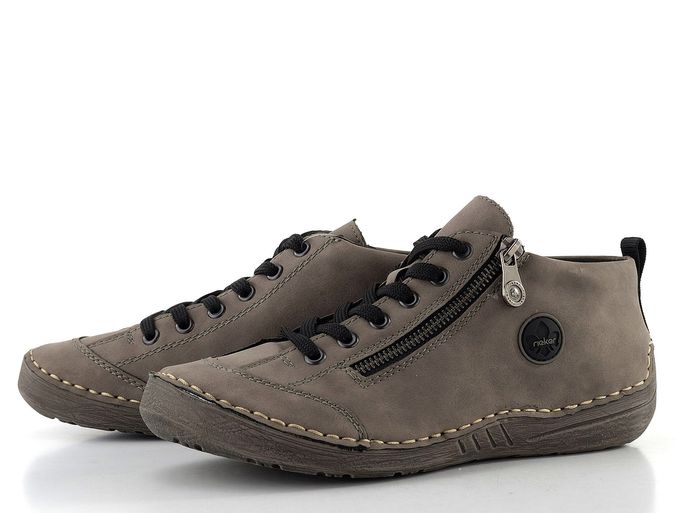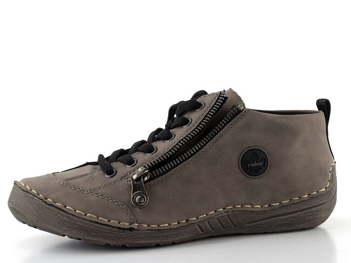 Nízký dámský kotník od značky Rieker spojuje styl a pohodlí v jednom. Tento model 52514-42, vyrobený ze syntetického materiálu s imitací nubuku, vyniká šedou barvou s nádechem do hněda, která se skvěle hodí pro podzimní a zimní období. Klasické šněrování je doplněno o praktický postranní zip, což usnadňuje obutí.