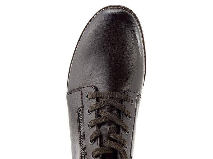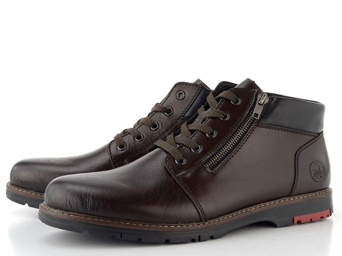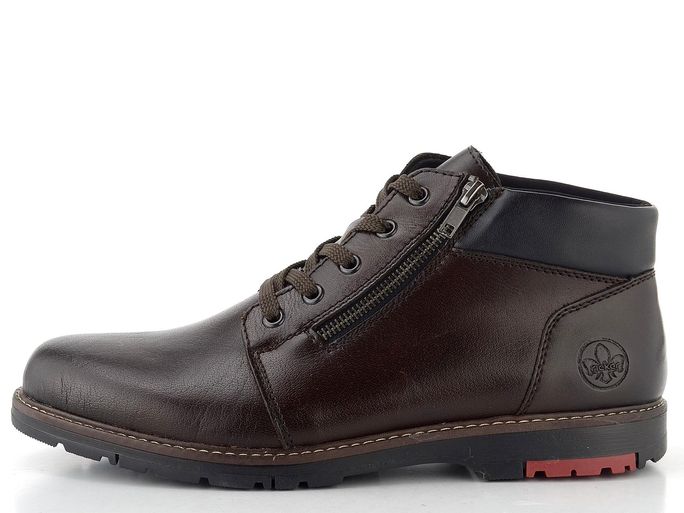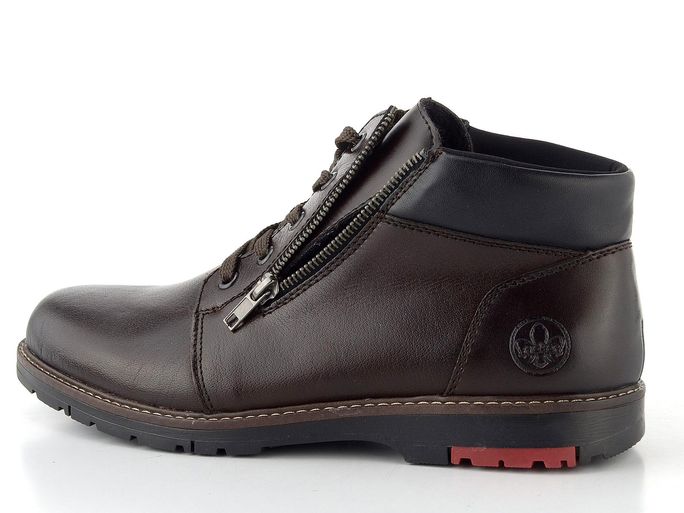 Pánský vyteplený kotník od značky Rieker představuje ideální volbu pro podzimní a zimní měsíce. Jeho jednoduchý a elegantní střih v temně hnědé barvě skvěle doplní váš městský outfit. Svršek z přirozeně strukturované kůže a syntetického materiálu zajišťuje jak styl, tak i pohodlí. Praktické šněrování s kulatými tkaničkami a boční zip usnadňuje obutí, zatímco hustá vlněná podšívka udržuje nohy v teple. Široký podpatek a latexová podešev poskytují stabilitu a komfort při každém kroku. Tento model s výškou kotníku 8,5 cm se stane vaším spolehlivým partnerem na procházkách i v kanceláři.