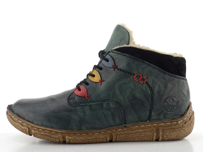 Zimní dámský šněrovací kotník v zelené barvě od značky Rieker je ideálním společníkem pro chladné dny. Je vyroben z kůže s mačkanou strukturou, což zaručuje nejen stylový vzhled, ale i pohodlí. Tmavě zelená (petrol) barva s jemným stínováním do černa dodává botám elegantní vzhled, zatímco barevná poutka od tkaniček v červené, žluté a modré barvě přidávají hravý prvek.