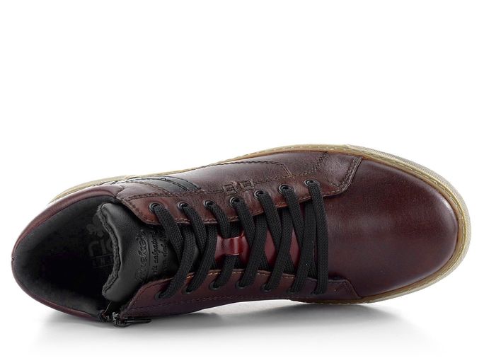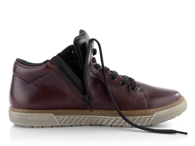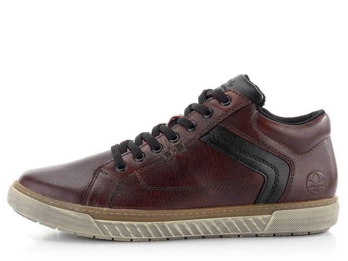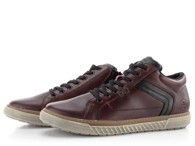 Pánský kožený kotník od značky Rieker v klasickém střihu je ideální volbou pro podzimní a zimní sezónu. Tento model v odstínu vínové s nádechem do hněda vyniká svým kulatým střihem v pohodlné šíři G. Svršek je tvořen pevnou hladkou kůží, která je doplněna černými detaily. Pro snadné obutí je na vnitřní straně umístěn funkční zip. Vnitřní mírně teplá vlasová podšívka a vyměkčený jazyk s patním lemem zajišťují maximální komfort. Stélka, potažená hladkou kůží, je měkká a pohodlná. Monolitická latexová podešev a lepený výrobní způsob garantují dlouhou životnost. Výška kotníku je 7 cm (bez podešve), což zajišťuje optimální podporu a ochranu. Tento model je perfektní volbou pro každodenní nošení do města i do kanceláře.