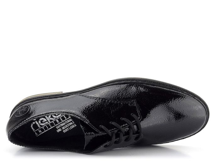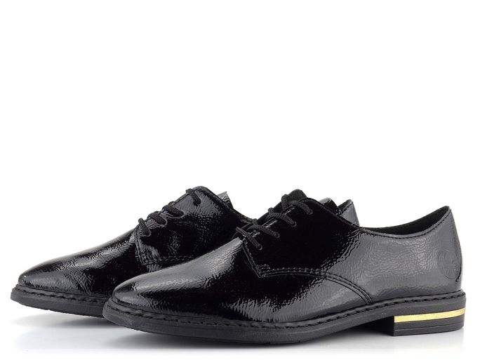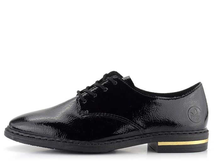 Elegantní a komfortní dámské polobotky od značky Rieker jsou ideální volbou pro podzimní a zimní sezónu. Tyto lakované boty jsou vyrobeny z krešlakové (mačkané) lakované kůže, která dodává každému kroku styl. Pohodlný kulatý střih je vhodný pro mírně užší až standardní typ chodidla. Boty mají šněrování a uvnitř naleznete textilní podšívku a extra měkkou koženou stélku, což zajišťuje maximální komfort při nošení. Flexibilní syntetická podešev a nízký široký podpatek o výšce 2,5 cm s metalickým proužkem ve zlaté barvě dodávají botám nejen eleganci, ale i stabilitu. Šitý výrobní způsob zajišťuje vysokou flexibilitu, avšak doporučujeme boty používat především v suchém prostředí. Při nošení se na namáhaných místech přirozeně zvrásní, což je typická vlastnost materiálu, nikoliv vada.