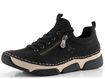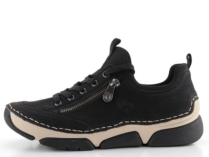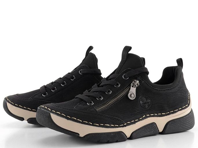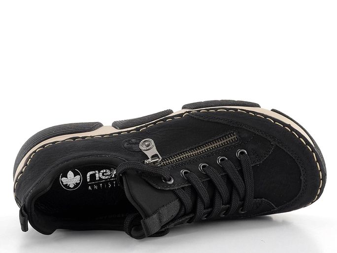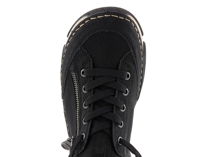 Dámské komfortní polobotky od značky Rieker jsou ideální volbou pro podzimní a zimní sezónu. Tyto černé polobotky se vyznačují širším střihem s kulatou špičkou, což zajišťuje pohodlí i při celodenním nošení. Svršek je vyroben z matné syntetiky a doplněn o šněrování s kovovými očky a plochými tkanicemi. Ozdobný zip dodává botám stylový vzhled, zatímco strečová textilie na lemu obuvi usnadňuje obutí a zvyšuje komfort. Uvnitř najdete měkkou softshellovou podšívku a stélku potaženou hladkou kůží. Vyšší odlehčená podešev přispívá k pohodlí při chůzi. Boty jsou vyrobeny šitým způsobem, který je velmi pohodlný a flexibilní, avšak nezaručuje vodotěsnost. Pro zvýšení odolnosti vůči vlhku doporučujeme použití impregnačních přípravků. Tyto polobotky jsou nejlepší volbou pro suché prostředí a městské prostředí.