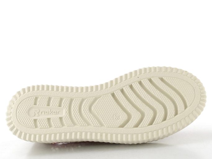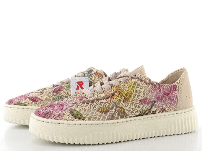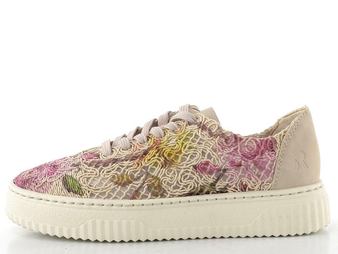Stylové dámské letní tenisky od značky Rieker jsou ideální volbou pro každodenní nošení. S barevným květinovým vzorem na krémovém podkladu, který v sobě kombinuje růžovou, žlutou a zelenou, dodají vašemu outfitu šmrnc. Prodyšný textilní svršek a lehká platforma zajišťují pohodlí během celého dne. Klasické šněrování s plochými tkanicemi a vyztužený opatek poskytují skvělou oporu. Měkce podložený jazyk a vyjímatelná vložka s podporou nožní klenby přispívají k celkovému komfortu. Tyto tenisky jsou nejen módní, ale i praktické pro jarní a letní dny.