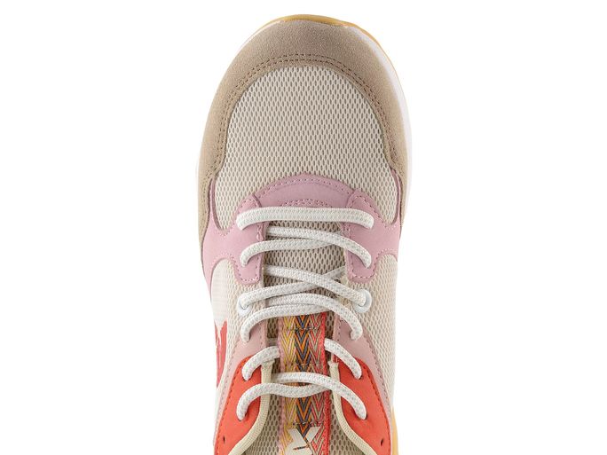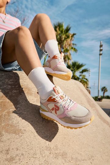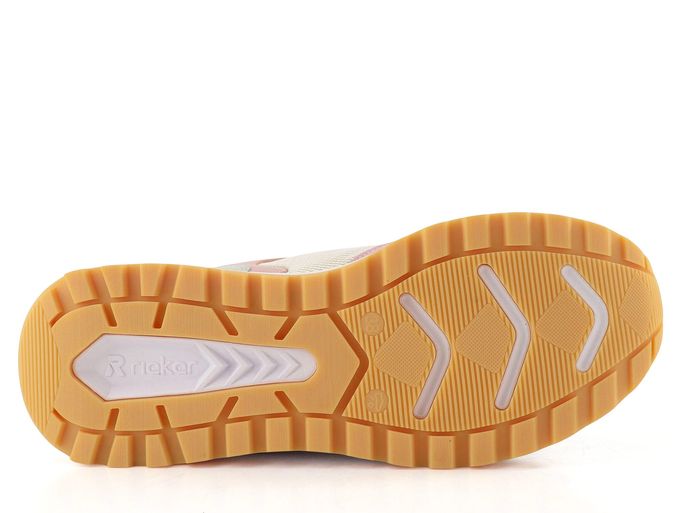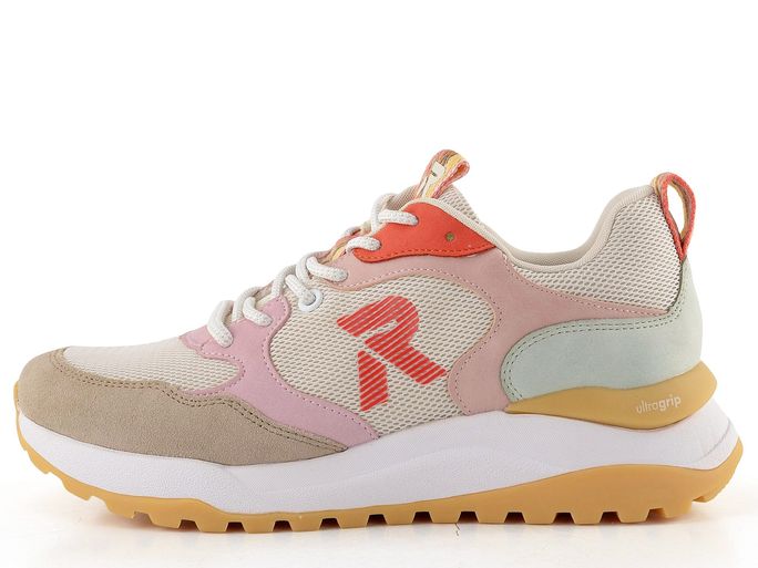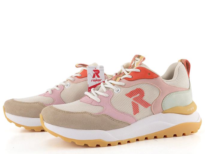 Stylové tenisky Rieker Sport W2506-61 jsou ideální volbou pro ženy, které hledají kombinaci komfortu a módního designu. Svršek z matné a broušené syntetiky a textilie v barevné kombinaci béžové, světle růžové, pudrové, oranžové a bledě modré dodává obuvi jedinečný vzhled.