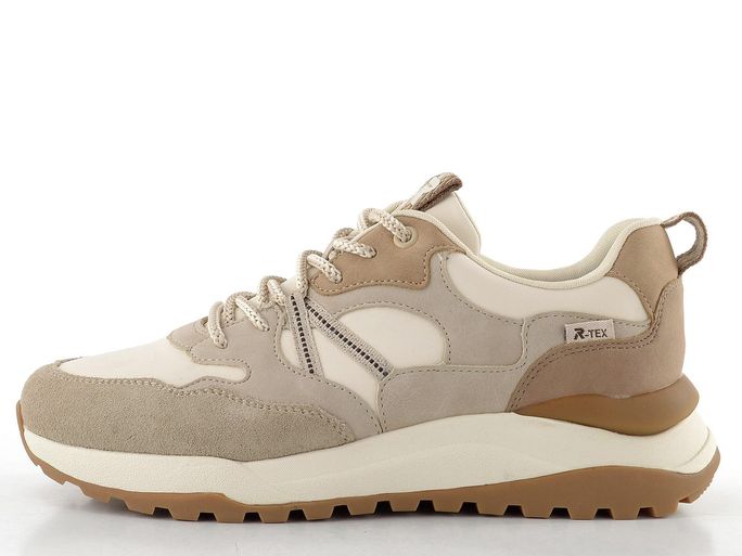 Stylové Rieker Sport tenisky v béžové barvě jsou ideální volbou pro podzimní a zimní dny. Tyto uzavřené boty kombinují syntetiku a textílii, což zajišťuje nejen moderní vzhled, ale i vysoký komfort nošení. Vybavené vodoodpudivou membránou R-TEX®, chrání vaše nohy před nepříznivým počasím.