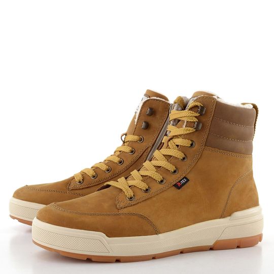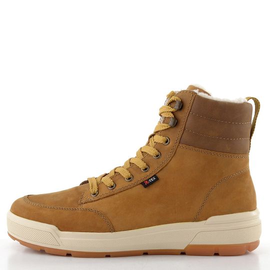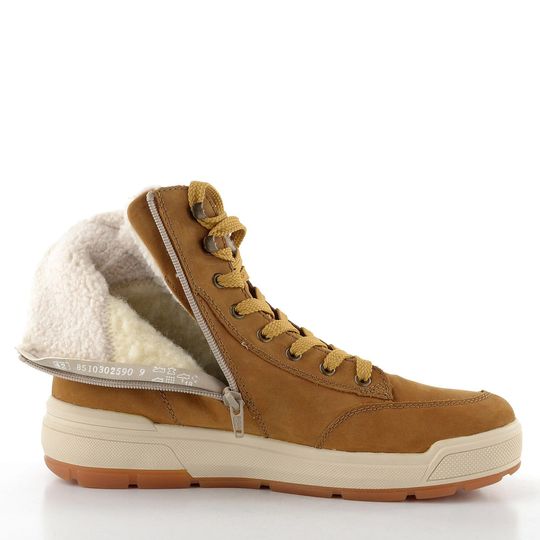 Pánský zimní kotník od značky Rieker kombinuje styl a funkčnost, ideální pro chladné podzimní a zimní dny. Tento model, součást kolekce Rieker Sport, se pyšní svrchním materiálem z nubukové kůže v elegantní okrové hnědé barvě, doplněné světle hnědou bandáží. Pro snadné obutí je na vnitřní straně vybaven zipem. Silně polstrovaný kotníkový lem zajišťuje pohodlí a teplo, zatímco teplá podšívka ze střižní ovčí vlny dodává extra komfort. S vodoodpudivou membránou R-TEX® a vyjímatelnou vložkou s podporou nožní klenby jsou tyto boty skvělou volbou pro každodenní nošení. Vysoká latexová podešev s hrubým vzorkem zajistí stabilitu na různých površích.