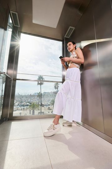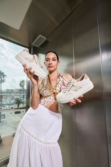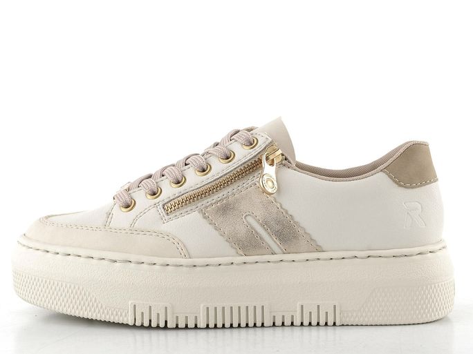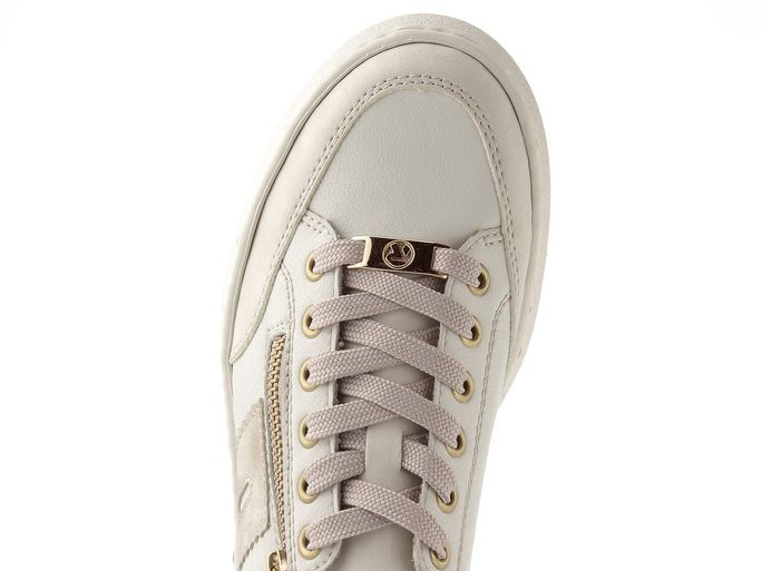 Stylové dámské tenisky od značky Rieker přinášejí kombinaci elegance a pohodlí, ideální pro jarní a letní dny. Svršek z jemně strukturované kůže v béžové barvě s metalickými detaily dodává těmto teniskám šmrnc. Prostorná kulatá špička a měkká stélka potažená hladkou kůží zajišťují maximální komfort při nošení. Klasické šněrování je doplněno o funkční postranní zip, který usnadňuje obutí. Ultra lehká vysoká platforma s výškou podpatku 4,5 cm přidává na stylu, zatímco šitý výrobní způsob garantuje flexibilitu. Tyto tenisky jsou skvělou volbou pro každodenní nošení, ať už do města nebo na lehkou procházku.