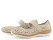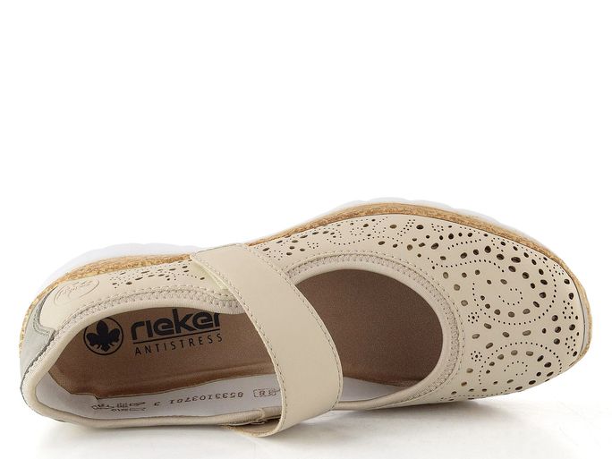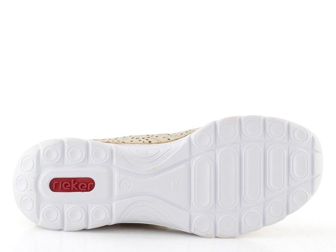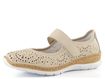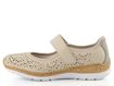 Pohodlné dámské baleríny od značky Rieker spojují sportovnější design s elegancí. Svršek z hladkého syntetického materiálu s prořezávaným vzorem dodává modelu vzdušnost a styl. Béžová barva se šedým doplňkem na patě skvěle doplní váš jarní a letní outfit. Funkční pásek na suchý zip přes nárt zajišťuje dokonalé přizpůsobení a pohodlí po celý den.