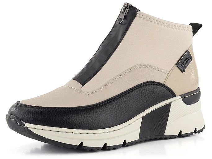 Stylové a pohodlné kotníkové boty od značky Rieker jsou ideální volbou pro podzimní a zimní období. Tyto boty vynikají sportovnějším střihem a kombinací černé a béžové barvy, která je nejen atraktivní, ale i snadno kombinovatelná s vaším šatníkem. Svršek tvoří strukturovaná syntetika a pružná softshellová textilie, což zajišťuje pohodlí a flexibilitu při každém kroku. Patní díl je lakovaný, což dodává botám elegantní vzhled.