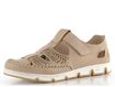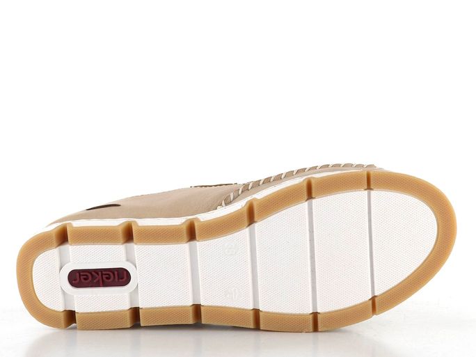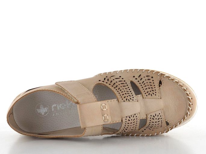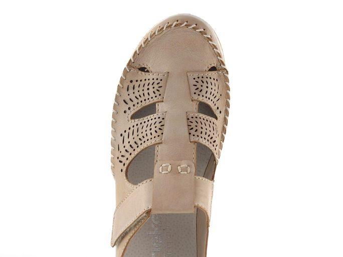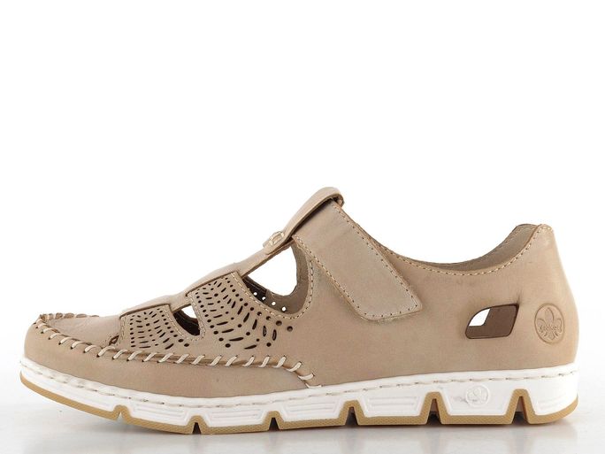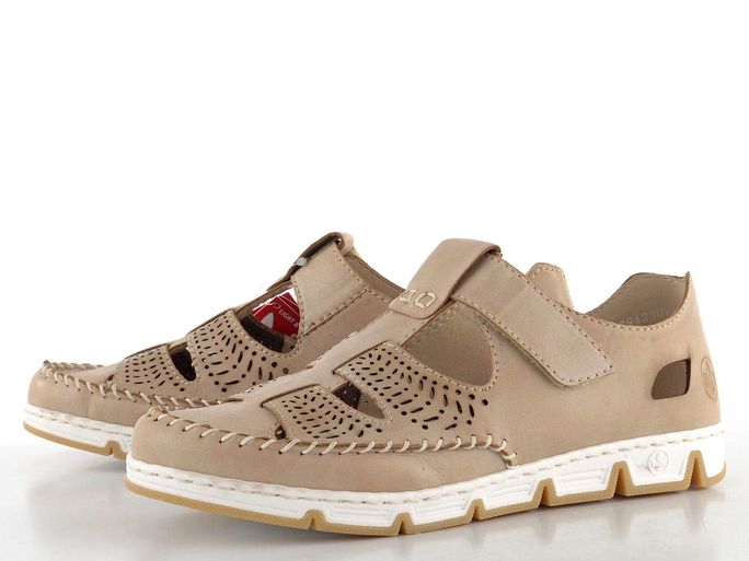 Letní dámské polobotky značky Rieker jsou ideální volbou pro pohodlnou chůzi ve městě i na lehké procházky. Tento model je vyroben z poddajné hladké kůže v lehce stínovaném béžovém odstínu, což dodává botám elegantní vzhled. Díky prořezávání je zajištěno příjemné odvětrávání chodidla. Polobotky mají prostornou kulatou špičku a upínací pásek na suchý zip na nártu, což usnadňuje jejich obouvání. Vnitřní podšívka je kombinací kůže a syntetiky, zatímco měkká stélka je potažena kůží pro maximální komfort. Flexibilní latexová podešev ve sportovnějším stylu a výška podpatku 2,3 cm zajišťují pohodlnou chůzi po celý den. Tento model je vyroben šitým výrobním způsobem, což zaručuje jeho trvanlivost a kvalitu.