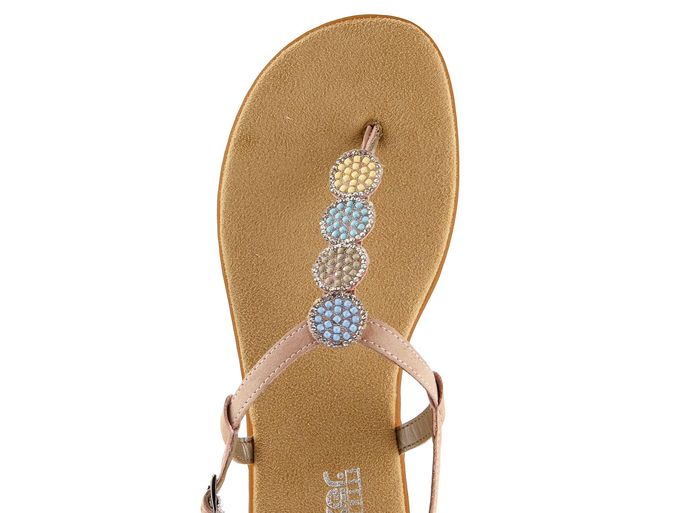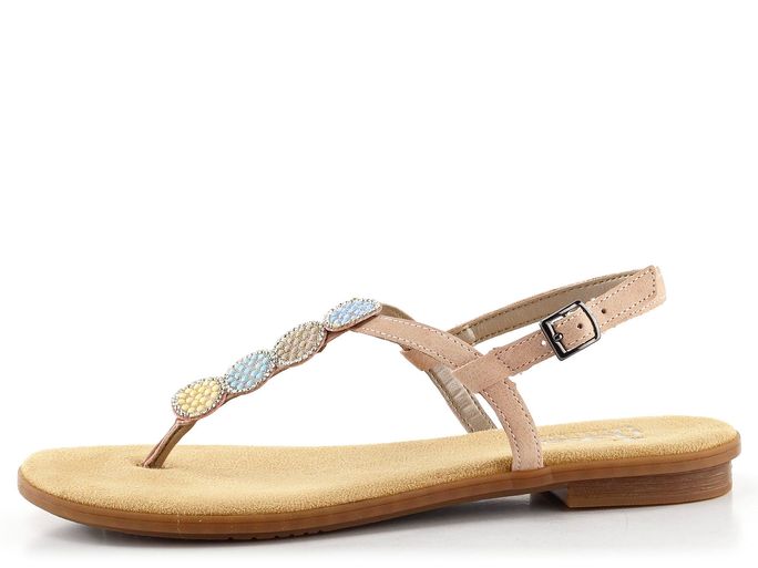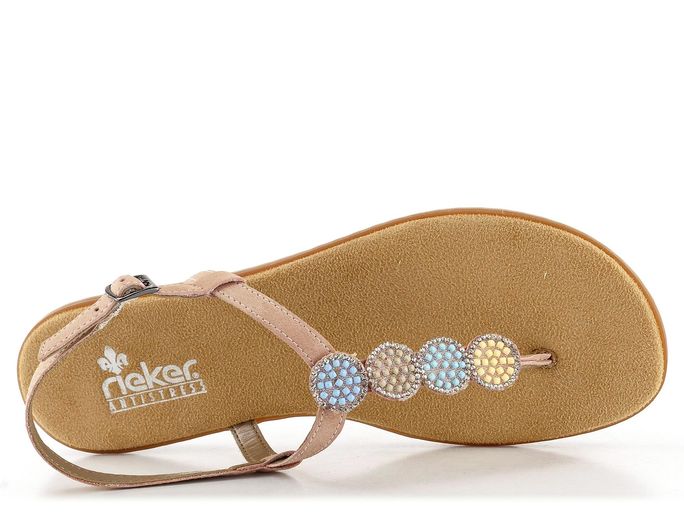 Elegantní dámské sandálky/žabky od značky Rieker ve stylovém starorůžovém odstínu přinášejí nejen krásný vzhled, ale i pohodlí. Svršek je vyroben ze syntetického materiálu, který je lehký a snadno udržovatelný. Na nártu najdete kruhové aplikace poseté plastovými kamínky v pastelových odstínech žluté, tyrkysové, šedozelené a modré barvy, doplněné blyštivými krystaly. Pásek mezi prsty a nastavitelný patní pásek s pruženkou zajišťují, že sandálky dobře sedí na noze. Měkká stélka potažená savou textilií a flexibilní latexová podešev s nízkým podpatkem (1,8 cm) poskytují maximální komfort při chůzi. Tyto sandálky jsou ideální volbou pro jarní a letní městské procházky nebo lehké výlety. Díky svému decentnímu designu a kvalitnímu zpracování se stanou oblíbeným kouskem ve vašem botníku.
