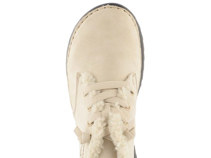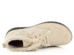 Svršek z imitace nubuku v jemné béžové barvě s lehkým stínováním dodává botám elegantní vzhled. Uvnitř najdete hebkou podšívku s krátkým vlasem, která poskytuje mírné zateplení, a měkkou pohodlnou stélku potaženou filcem. Lem z umělého beránku přidává na celkovém komfortu a stylu.