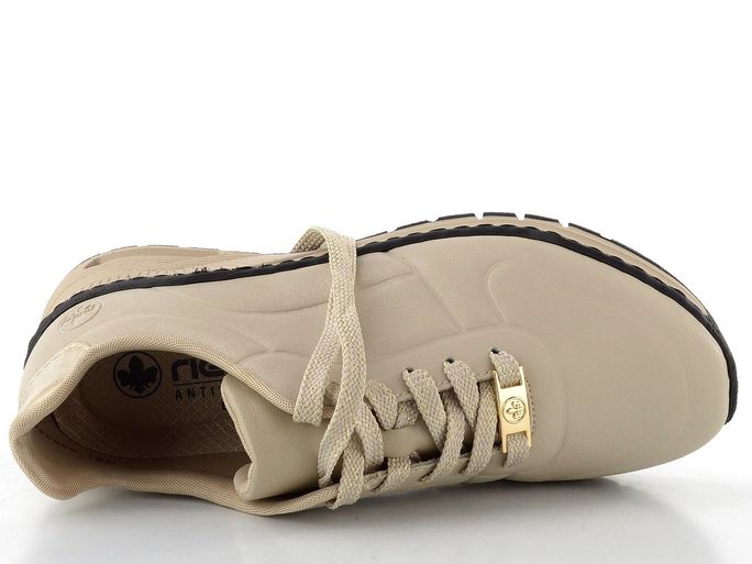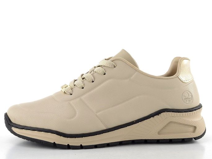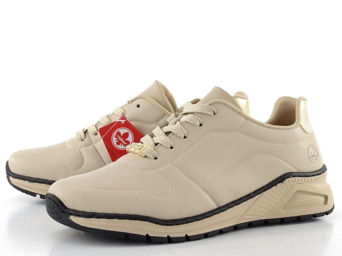 Pro ženy, které hledají stylové a pohodlné obuv, představujeme tenisky na klínku v béžové barvě od značky Rieker. Tyto dámské tenisky jsou navrženy s ohledem na širší chodidlo, což zaručuje maximální komfort při nošení. Svršek z hladké syntetiky v kombinaci s metalickými doplňky ve zlaté barvě dodává obuvi elegantní vzhled.