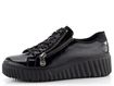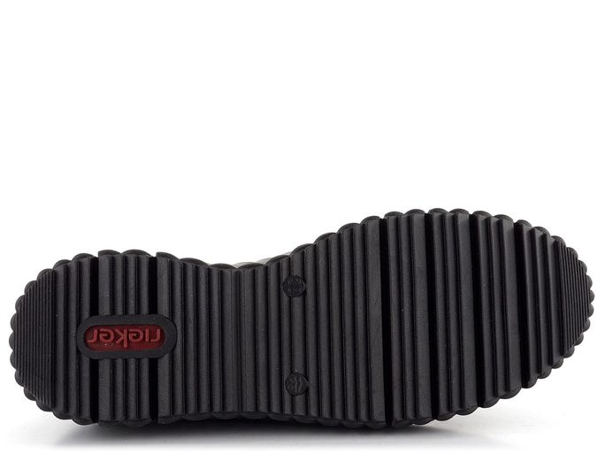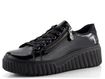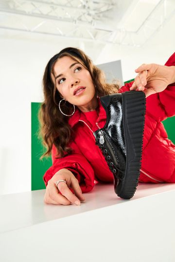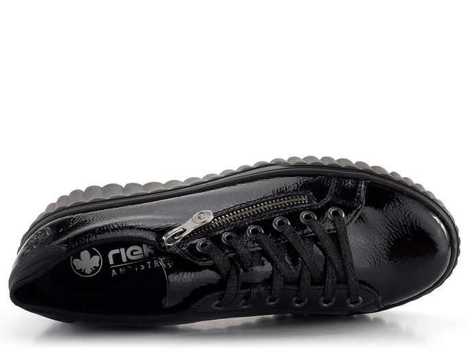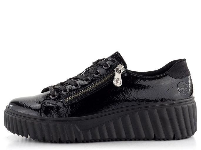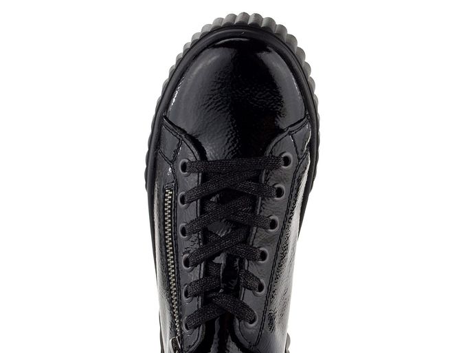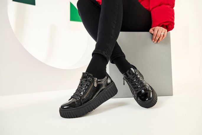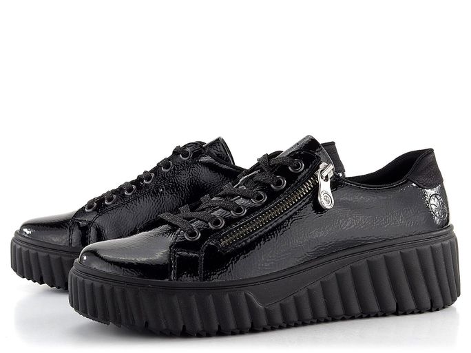 Stylové dámské lakované tenisky na vysoké módní platformě od značky Rieker jsou ideální volbou pro podzimní a zimní sezónu. Svršek z mačkané lakované povrstvené kůže v elegantní černé barvě dodává teniskám jedinečný vzhled. Klasické šněrování s plochými tkaničkami s jemným lurexem a postranní zip zajišťují snadné obutí. Polstrovaný kotníkový lem a jazyk spolu s měkkou vyjímatelnou stélkou s podporou podélné nožní klenby a patním absorbérem poskytují maximální pohodlí. Vysoká platforma s příměsí latexu a hrubší protiskluzový vzorek podešve zajišťují stabilitu a bezpečnost při chůzi. Tyto tenisky jsou nejen stylové, ale také praktické a komfortní. Poznámka: přirozené zvrásnění materiálu v namáhaných místech je typickou vlastností materiálu, nikoliv vadou.