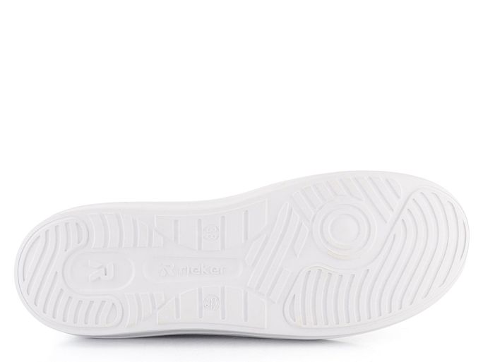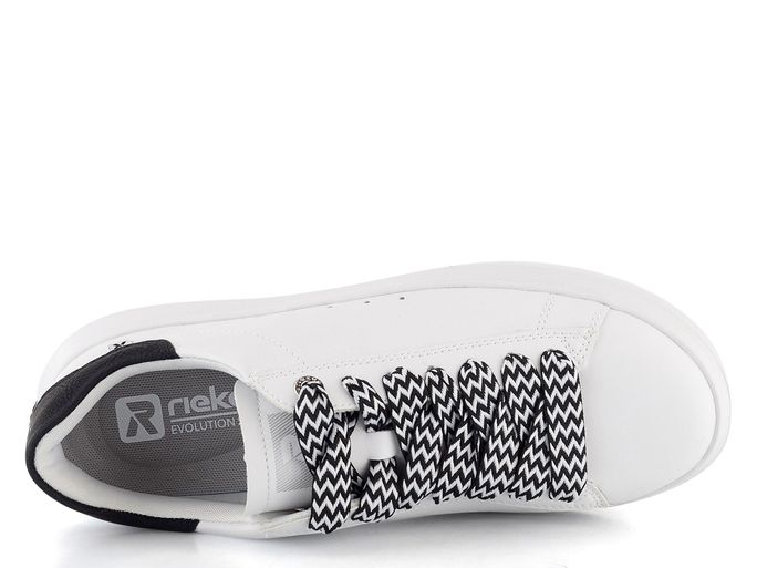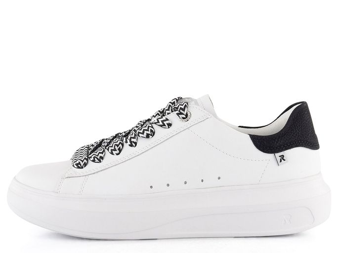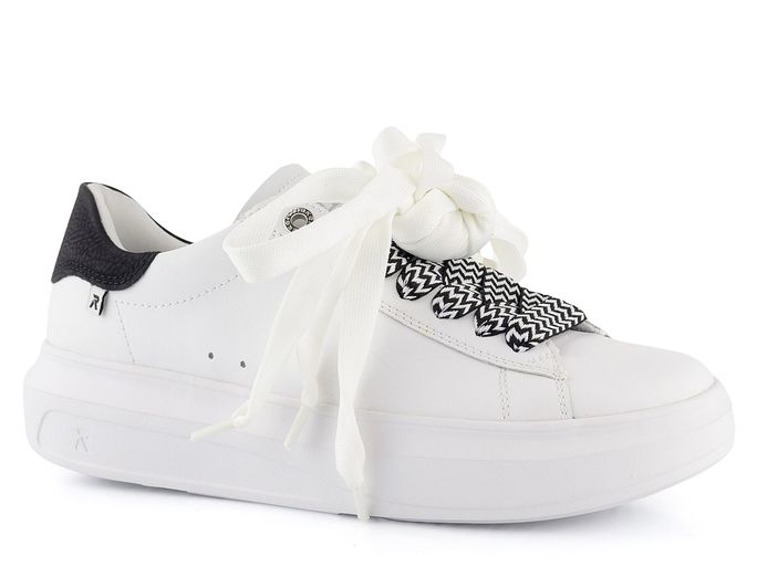 Stylové dámské tenisky od značky Rieker přinášejí dokonalou kombinaci komfortu a moderního designu. Vyrobené z povrstvené kůže, tyto boty vynikají svou bílou barvou s kontrastním černým patním dílem. Klasické šněrování s plochými tkaničkami v černo-bílém vzoru dodává teniskám sportovní nádech. Extra polstrovaný kotníkový lem a měkká vyjímatelná stélka s podporou nožní klenby zajišťují pohodlí po celý den. Díky lehkým vysokým platformám a textilní podšívce jsou ideální volbou pro jarní a letní městské procházky. Výška podpatku 4,5 cm poskytuje elegantní vzhled bez ztráty komfortu.