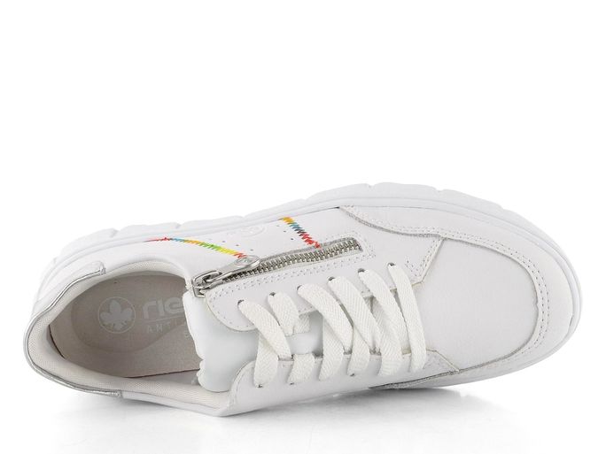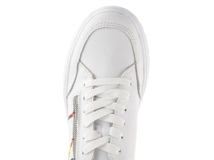 Dámské tenisky od značky Rieker představují ideální volbu pro ty, kteří hledají autentický design a trvalou kvalitu. Tyto bílé tenisky s jemným metalickým detailem na patě a duhovým štepem na boku dokonale ladí s jarními a letními outfity. Širší kulatý střih "H" poskytuje extra pohodlí, zatímco funkční postranní zip usnadňuje obouvání. Svršek z hladké povrstvené kůže v kombinaci se syntetickými prvky zajišťuje odolnost a styl. Měkká vyjímatelná stélka s podporou nožní klenby a vysoká syntetická podešev s hrubým vzorkem garantují komfort při každém kroku. Tyto boty jsou skvělou volbou pro každodenní nošení ve městě.