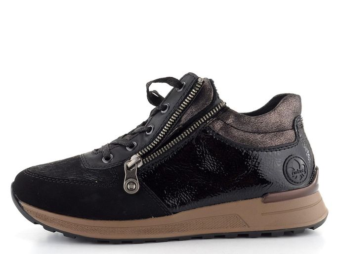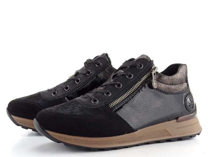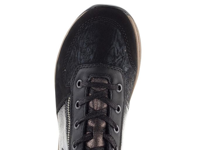 Vyzkoušejte dámské šněrovací tenisky v prostornějším provedení od značky Rieker, které jsou ideální na podzim a zimu. Tyto tenisky jsou navrženy pro maximální pohodlí a přizpůsobení se širšímu chodidlu či kloubkům díky širšímu střihu a pružné, mírně lesklé textilii na špičce a zboku. Kombinace syntetických materiálů a textilie zajišťuje odolnost a komfort, zatímco černá barva s tlumeným bronzovým odstínem dodává elegantní vzhled.
