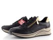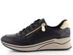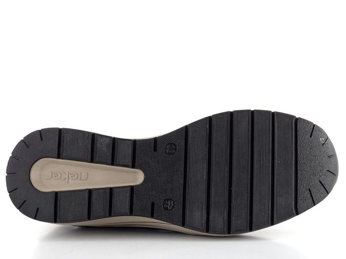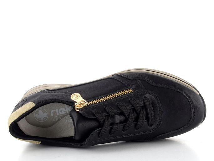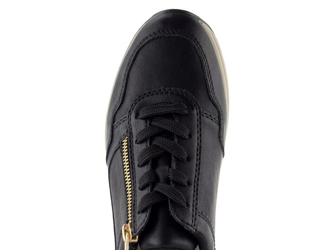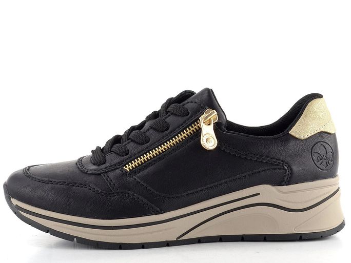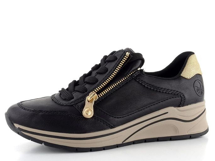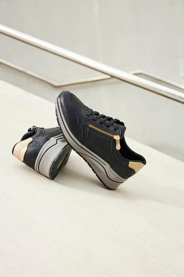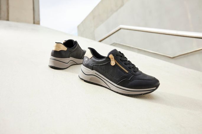Trendové dámské tenisky od značky Rieker kombinují styl a pohodlí pro každodenní nošení. Jsou ideální volbou pro ženy, které hledají komfortní obuv s moderním designem. Tyto tenisky se vyznačují prostorným kulatým střihem, který je vhodný pro širší chodidlo, a to díky označení "extra weit". Svršek je vyroben z kvalitní hladké syntetiky v elegantní černé barvě s metalickými zlatými doplňky. Praktický postranní zip usnadňuje obutí, zatímco měkčený obvodový lem a jazyk zajišťují pohodlí. Uvnitř najdete extra měkkou a vyjímatelnou vložku s podporou klenby. Lehkou podešev s mírným klínkem doplňuje latexový nášlap pro ještě větší komfort.