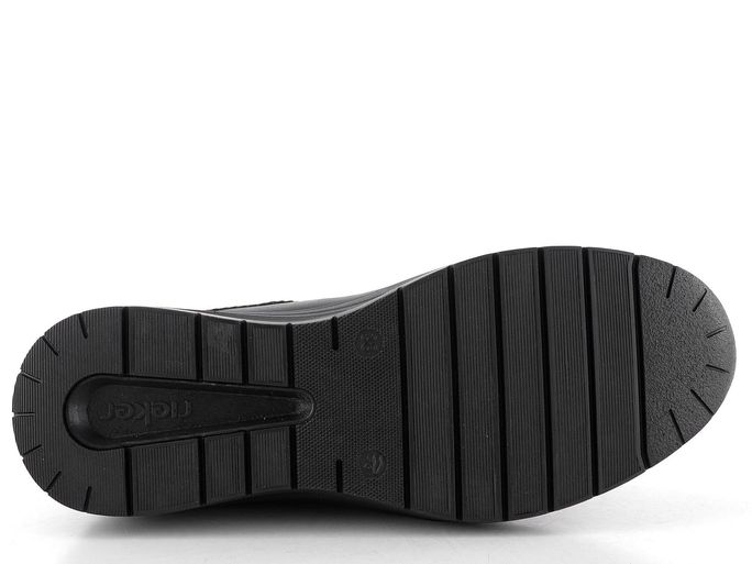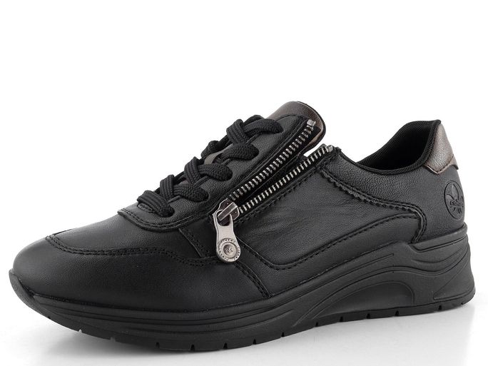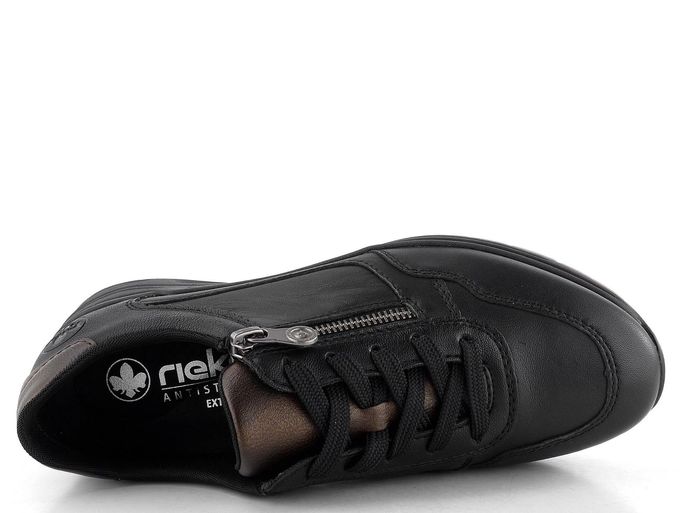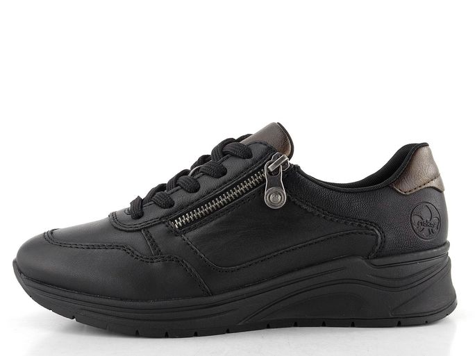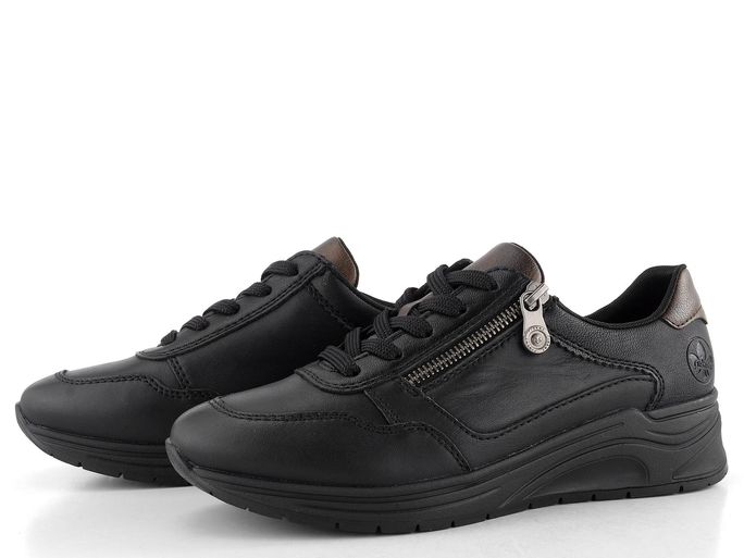 Dámské tenisky značky Rieker N9501-01 představují ideální volbu pro podzimní a zimní měsíce. Tyto stylové a pohodlné boty s malým klínkem nabízejí prostorný kulatý střih, který je ideální pro širší chodidla, což oceníte při celodenním nošení. Svršek z hladké kůže v kombinaci s metalickou syntetikou dodává teniskám elegantní vzhled v černé barvě s tmavě bronzovými doplňky.