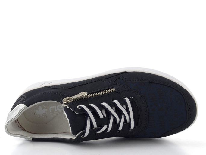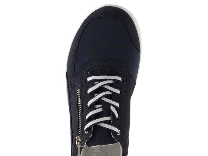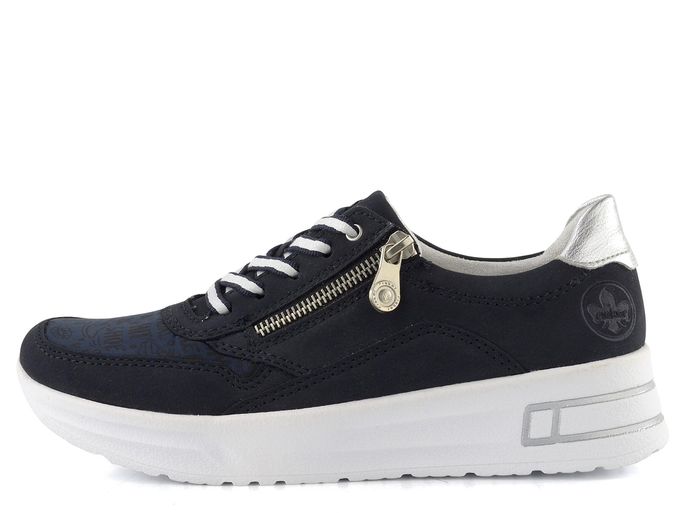 Dámské tenisky značky Rieker N8114-14 jsou ideální volbou pro jarní a letní dny. Tyto pohodlné boty v tmavě modré barvě kombinují styl a funkčnost. Svršek z matné syntetiky a pružné textilie zajišťuje prostorový kulatý střih, který je vhodný pro širší chodidla. Díky funkčnímu postrannímu zipu se snadno obouvají, zatímco klasické šněrování dodává sportovní vzhled.