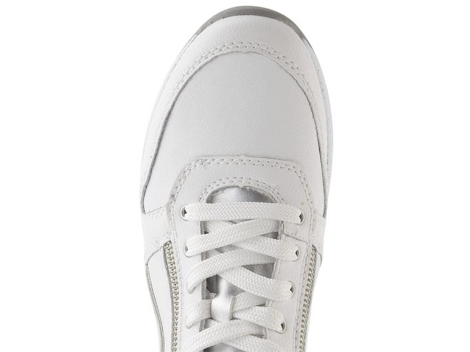 Dámské šněrovací tenisky od značky Rieker představují ideální volbu pro jarní a letní dny. Tyto tenisky v čistě bílé barvě s metalickými stříbrnými doplňky zaujmou nejen stylem, ale i pohodlím. S širším kulatým střihem "H" a vyjímatelnou koženou stélkou zajišťují komfort po celý den. Funkční zipy po obou stranách šněrování usnadňují obutí a dodávají moderní vzhled. Svršek z hladké povrstvené kůže a lehká syntetická podešev garantují kvalitu a trvanlivost. Tento model je skvělou volbou pro každou příležitost, ať už míříte do města, na procházku nebo do kanceláře.