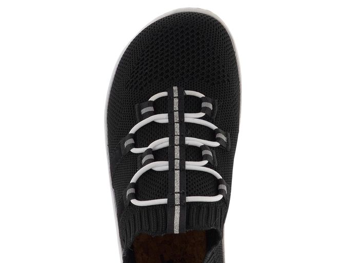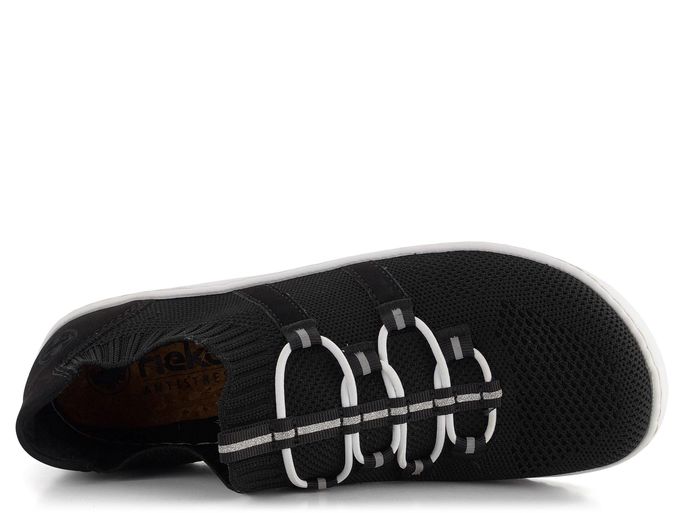 Dámské odlehčené vycházkové polobotky od značky Rieker nabízejí ideální kombinaci pohodlí a stylu. Tento model je navržen pro jarní a letní sezónu a je vhodný i pro mírně širší chodidla díky pohodlnému střihu a pružnému ponožkovému lemu. Svršek z úpletové textilie v kombinaci se syntetikou zajišťuje prodyšnost a flexibilitu, zatímco gumička místo šněrování usnadňuje nazouvání. Černá barva s bílými a stříbrnými doplňky dodává botám elegantní vzhled. Uvnitř najdete lehce vyměkčenou korkovou stélku, která působí antibakteriálně a je příjemná pro bosé chodidlo. Ultralehká a extra ohebná podešev zaručuje maximální komfort při každém kroku. Tyto polobotky jsou perfektní volbou pro každodenní nošení ve městě i na lehké procházky.