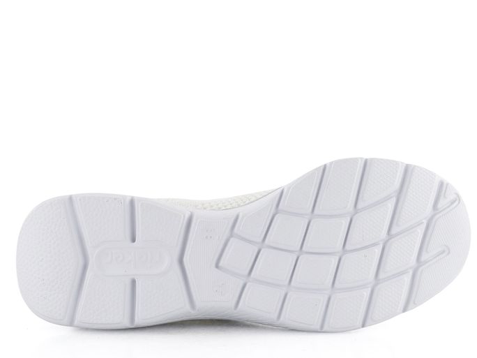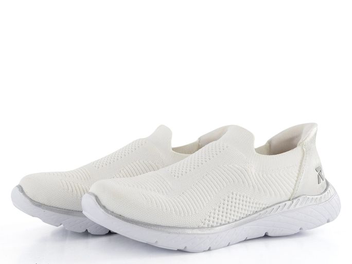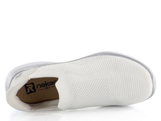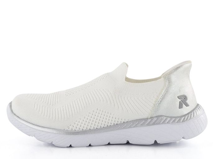 Dámské tenisky od značky Rieker přinášejí spojení pohodlí a stylu. Jsou ideální volbou pro moderní ženu, která hledá obuv na lehkou procházku městem či do kanceláře. Jejich sportovní střih s kulatou špičkou a úpletový svršek z textilie v kombinaci s metalickým patním dílem vytváří elegantní vzhled. Díky pružnému ponožkovému lemu a funkci Ready2GO je nazutí snadné a rychlé. Uvnitř vás potěší extra měkká stélka z paměťové pěny, která zajistí komfort při každém kroku. Lehké a flexibilní podešve v bílo-stříbrném provedení dodávají teniskám na atraktivitě. Tyto boty jsou zárukou kvality a trvalé hodnoty.
