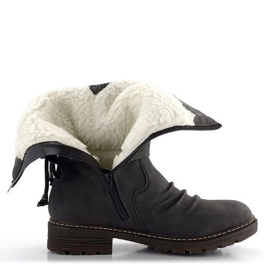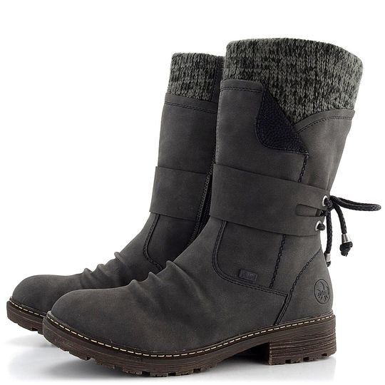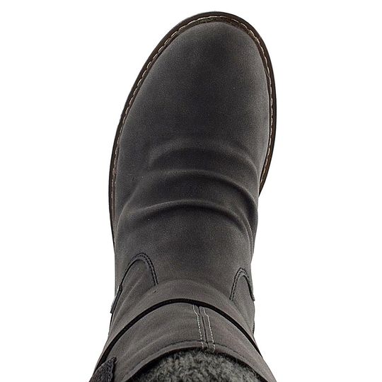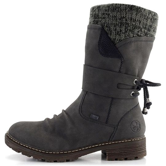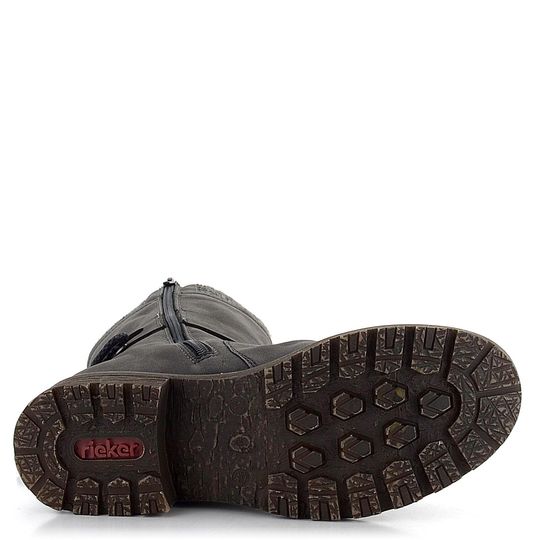 Dámské komfortní polokozačky od značky Rieker v tmavě šedé barvě jsou ideální volbou pro podzimní a zimní sezónu. Svršek je vyroben z matné syntetiky, doplněný melírovaným textilním nápletem a ozdobným řasením na nártu. Pro snadné nazutí je na vnitřní straně zip, zatímco na zadní straně najdete ozdobné šněrování s kovovými koncovkami. Velmi teplá podšívka z umělého beránku a měkká stélka s filcovým potahem zajistí maximální pohodlí. Obuv je vybavena vodoodpudivou membránou riekerTEX®, která vás ochrání před vlhkostí. Bytelná syntetická podešev s traktor vzorkem a širokým podpatkem (3,8 cm) poskytuje stabilitu a bezpečnost na každém kroku. Výška kotníku je 24 cm (bez podpatku), což zaručuje dostatečnou ochranu a teplo. Tento model je vyráběn lepeným způsobem, což zvyšuje jeho odolnost.