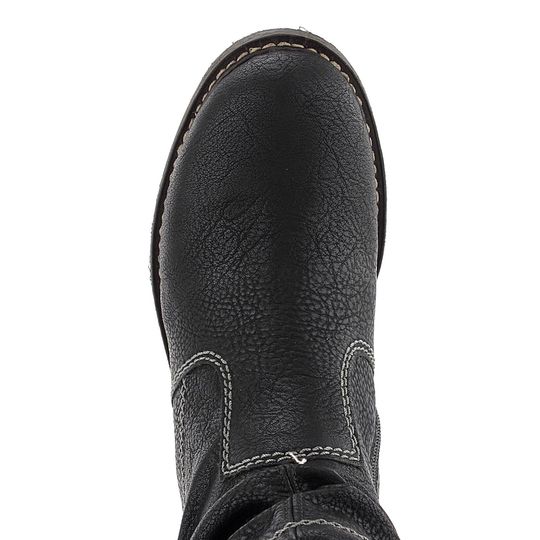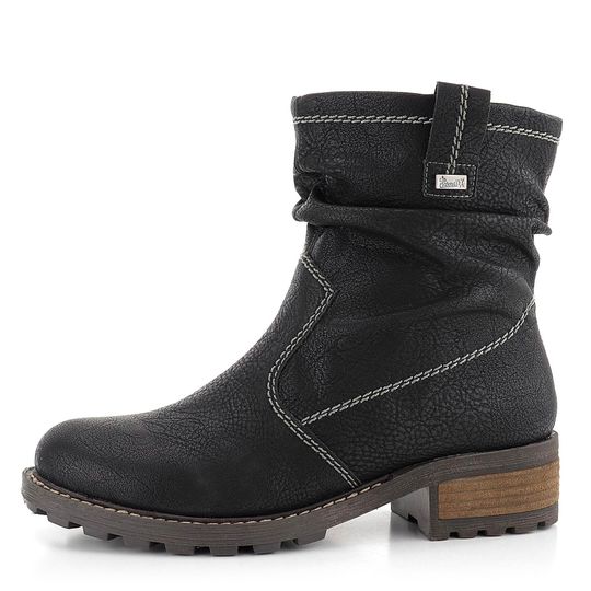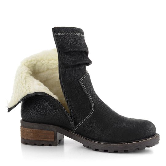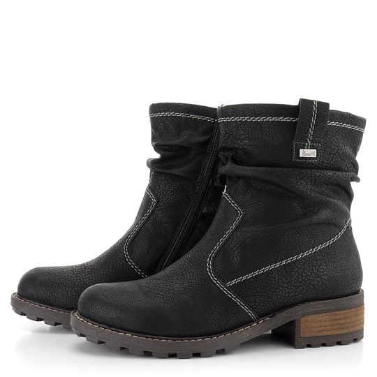 Pro chladné zimní dny přináší značka Rieker dámský vyšší kotník s membránou a beránkem, který vás udrží v teple. Svrchní materiál z strukturované syntetiky v elegantní černé barvě doplňuje světlejší štepování. Vnitřní podšívka z umělého beránku je hustá a velmi teplá, což zajišťuje maximální komfort. Díky postrannímu zipu je obutí rychlé a pohodlné. Boty jsou vybaveny vodoodpudivou membránou riekerTEX®, která chrání před vlhkostí. Nízký, široký podpatek o výšce 4,2 cm a hrubý vzorek na podešvi poskytují stabilitu a pohodlí při chůzi. Výška kotníku je 16 cm (bez podpatku), což zaručuje dostatečnou ochranu před chladem. Kombinace šitého a lepeného výrobního způsobu zajišťuje dlouhou životnost obuvi. Tento model je ideální volbou pro podzimní a zimní sezónu 2022/23.
