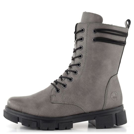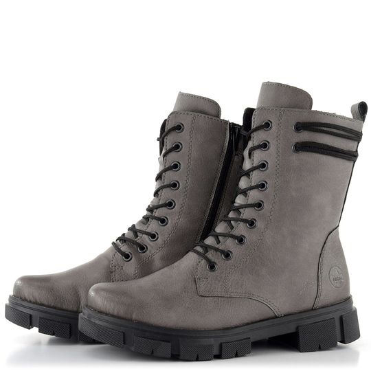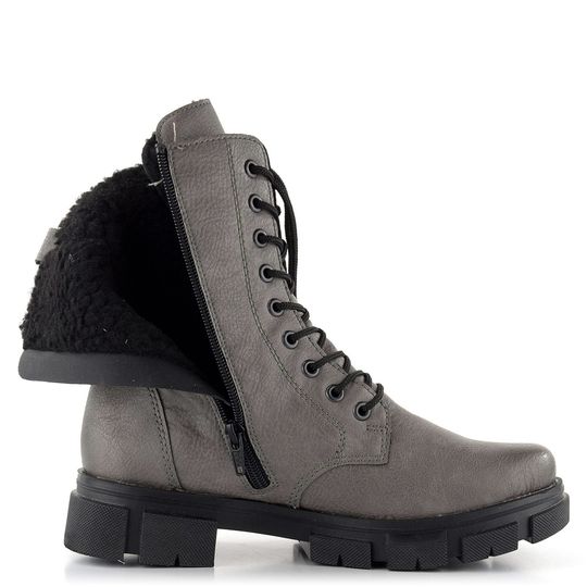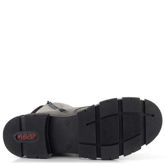 Dámský kotník značky Rieker je ideální volbou pro podzimní a zimní sezónu. Boty nabízejí prostorný, kulatý střih a jsou vyrobeny ze syntetického materiálu s jemnou strukturou. Tmavší šedý odstín se stínováním na špičce a patě dodává botám elegantní vzhled. Šněrování doplněné o zip na vnitřní straně usnadňuje obutí, zatímco ozdobné protažení tkaniček okolo kotníku přidává na stylu.