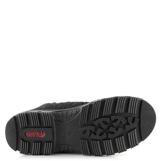 Hledáte spolehlivé boty pro zimní sezónu? Vyšší stahovací kotníkové boty od značky Rieker jsou ideální volbou. Tento sportovnější model sněhulí nabízí pohodlný střih s kulatější špičkou a je vyroben ze šusťákoviny. Díky vodoodpudivé membráně riekerTEX® zůstanou vaše nohy suché i v nepříznivých podmínkách. Postranní zip umožňuje snadné obutí, zatímco všitá léga zabraňuje vniknutí vlhkosti a sněhu. Horní lem s tunýlkem a všitou olivkou umožňuje snadné nastavení obvodu. Vnitřní teplá podšívka z umělého beránka a vyjímatelná stélka potažená filcem zaručují maximální komfort. Boty mají bytelnou podešev s vysokým podílem latexu a hrubší protismykový vzorek, což zajišťuje bezpečnou chůzi na kluzkém povrchu. Výška podpatku je 4,5 cm a výška kotníku 18 cm. Tento model z kolekce 2022/23 je skvělou volbou pro každou ženu, která hledá funkční a stylovou obuv do zimního období.