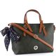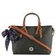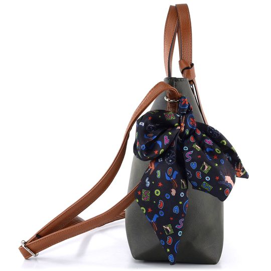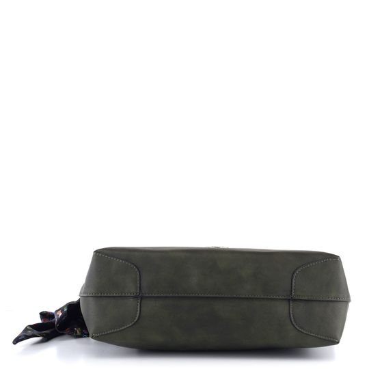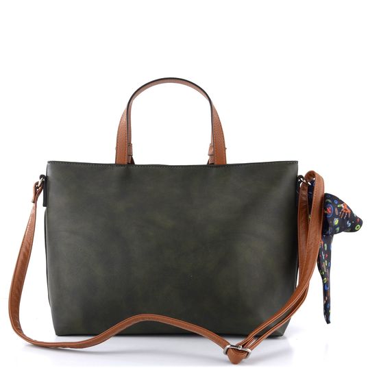 Dámská shopper kabelka v tmavě zelené barvě s madly do ruky a ramenním popruhem, zdobená barevnou saténovou mašlí.