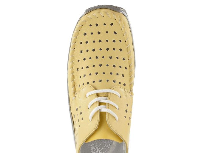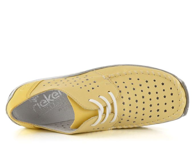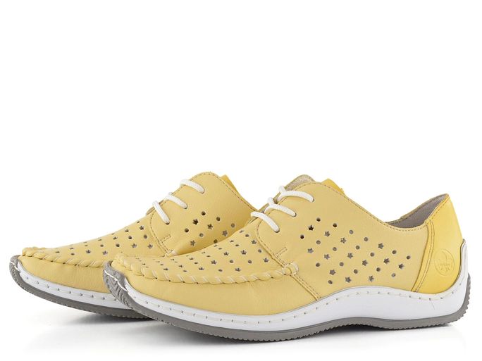 Pro dámy, které hledají pohodlí a styl, jsou tu žluté perforované polobotky na šněrování od značky Rieker. Tyto boty jsou ideální volbou pro jaro a léto díky své světlé pastelově žluté barvě a prodyšnému designu. Svršek bot je vyroben z povrstvené kůže s prořezávaným vzorem kruhů a hvězdiček, což dodává obuvi unikátní vzhled. Pata a jazyk jsou ze syntetického materiálu, který zajišťuje odolnost a pohodlí. Uvnitř najdete měkkou koženou stélku a syntetickou podšívku, které poskytují maximální komfort při každém kroku. Vyšší kontrastní podešev a flexibilní šitý výrobní způsob zajišťují, že boty jsou nejen stylové, ale i praktické. S výškou podpatku 2,7 cm jsou tyto polobotky skvělou volbou pro každodenní nošení. Vyberte si kvalitu a styl od značky Rieker.
