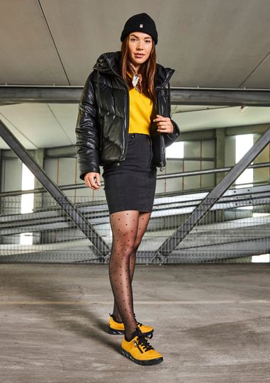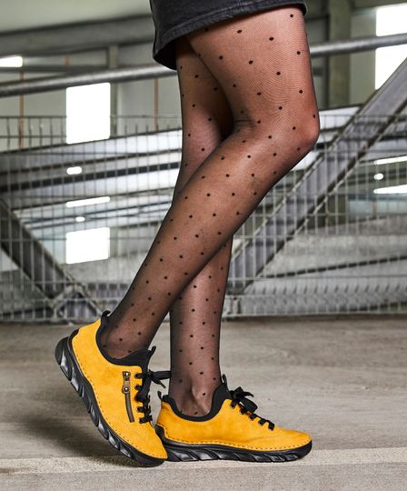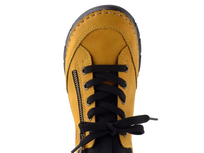 Dámské polobotky značky Rieker jsou ideální volbou pro podzimní a zimní dny. Jejich pěkný hořčicově žlutý odstín dodá vašemu outfitu svěží nádech. Svršek z matného syntetického materiálu a strečová softshellová textilie na kotníkovém lemu zajišťují pohodlí a flexibilitu. Model nabízí kombinaci šněrování a pružného nártu, což umožňuje snadné nazouvání bez nutnosti zavazování. Uvnitř se nachází polstrovaná softshellová podšívka a měkká stélka s koženým potahem, které zaručují komfort při každém kroku. Lehká sportovní podešev dodává obuvi potřebnou stabilitu. S výškou podpatku 3,5 cm jsou tyto polobotky ideální pro každodenní nošení.