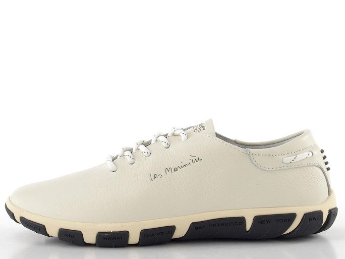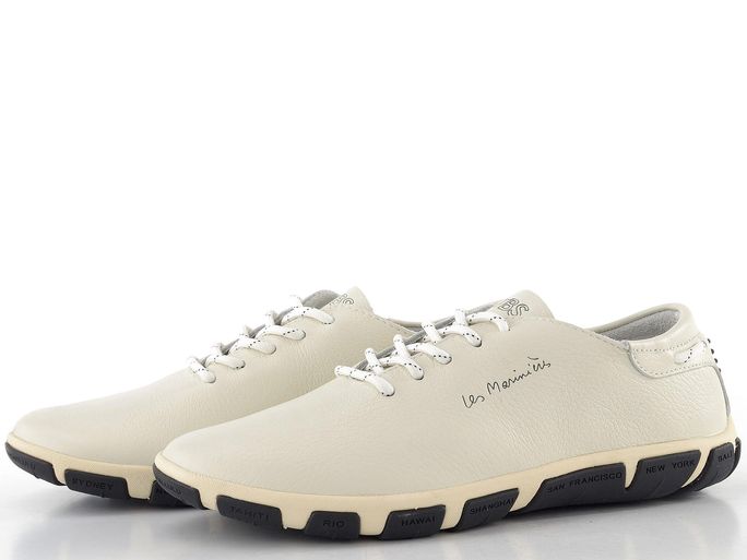Klasické kožené tenisky od francouzské značky TBS spojují nadčasový design s moderními prvky pro pohodlné nošení. Svršek z jemně strukturované telecí kůže v jemné smetanové barvě s černými doplňky dodává elegantní vzhled. Prostorná kulatá špička a šněrování s kulatými tkaničkami zaručují komfort i během celodenního nošení. Vyjímatelná perforovaná vložka zajišťuje lepší odvětrání, zatímco tlumicí systém v podešvi poskytuje maximální pohodlí. Podešev s názvy světových měst a protiskluzovým vzorem přináší stabilitu na každém kroku. Tyto tenisky jsou ideální volbou pro ženy, které hledají styl a pohodlí v jednom.
