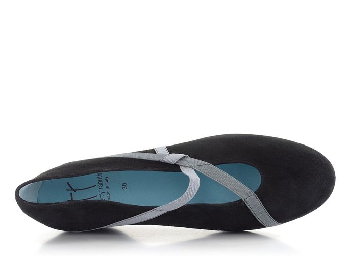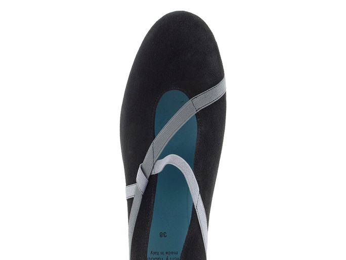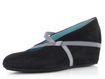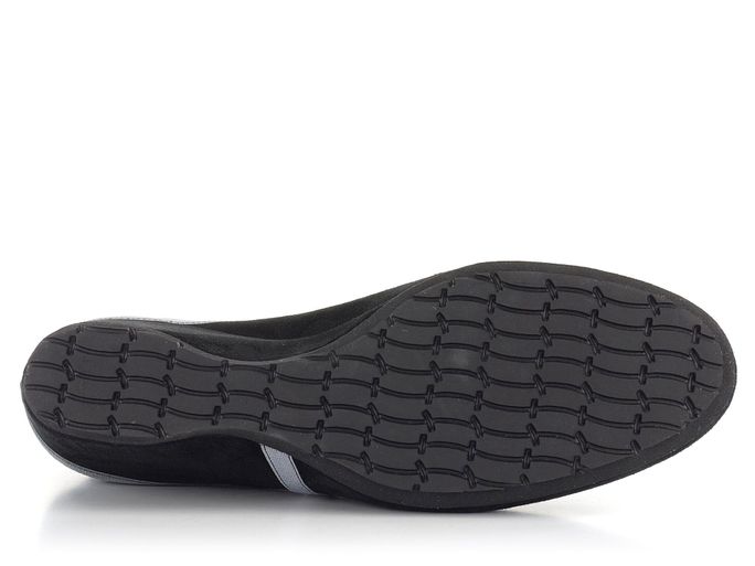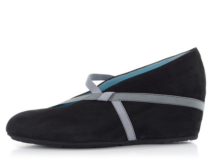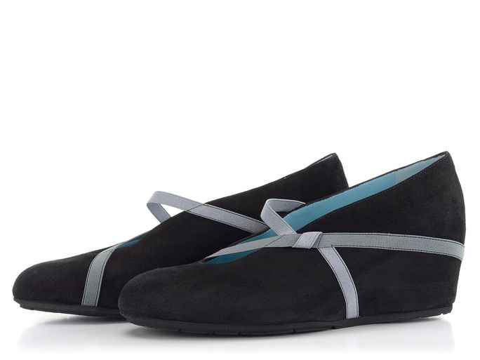 Luxusní dámské lodičky z černé semišové kůže, s gumičkami na nártu a na pohodlném skrytém klínku.