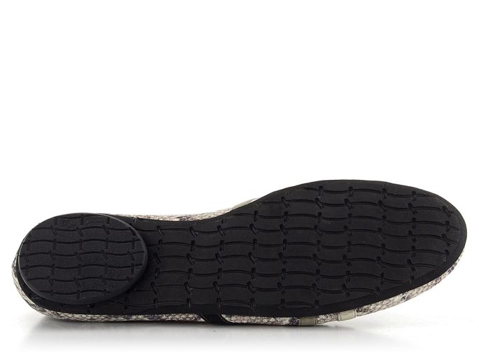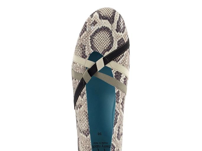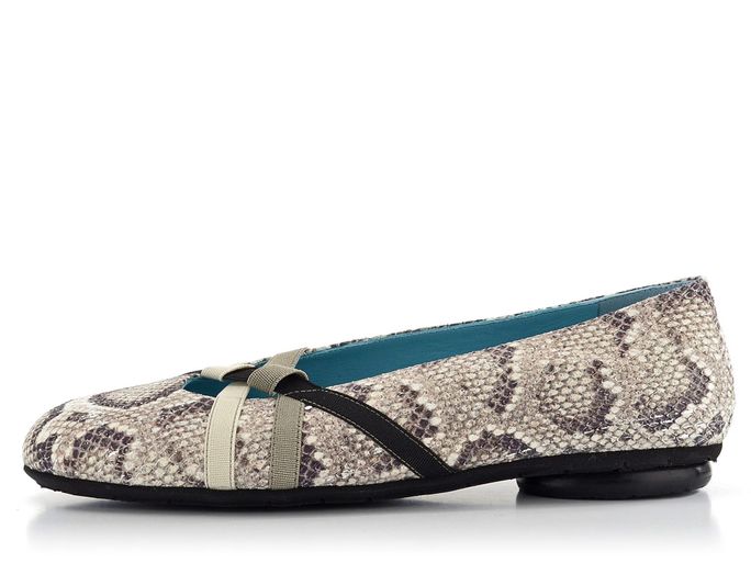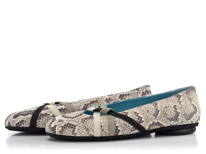 Luxusní dámské baleríny z kůže s hadinkovým vzorem a v béžových odstínech s metalickými odlesky.